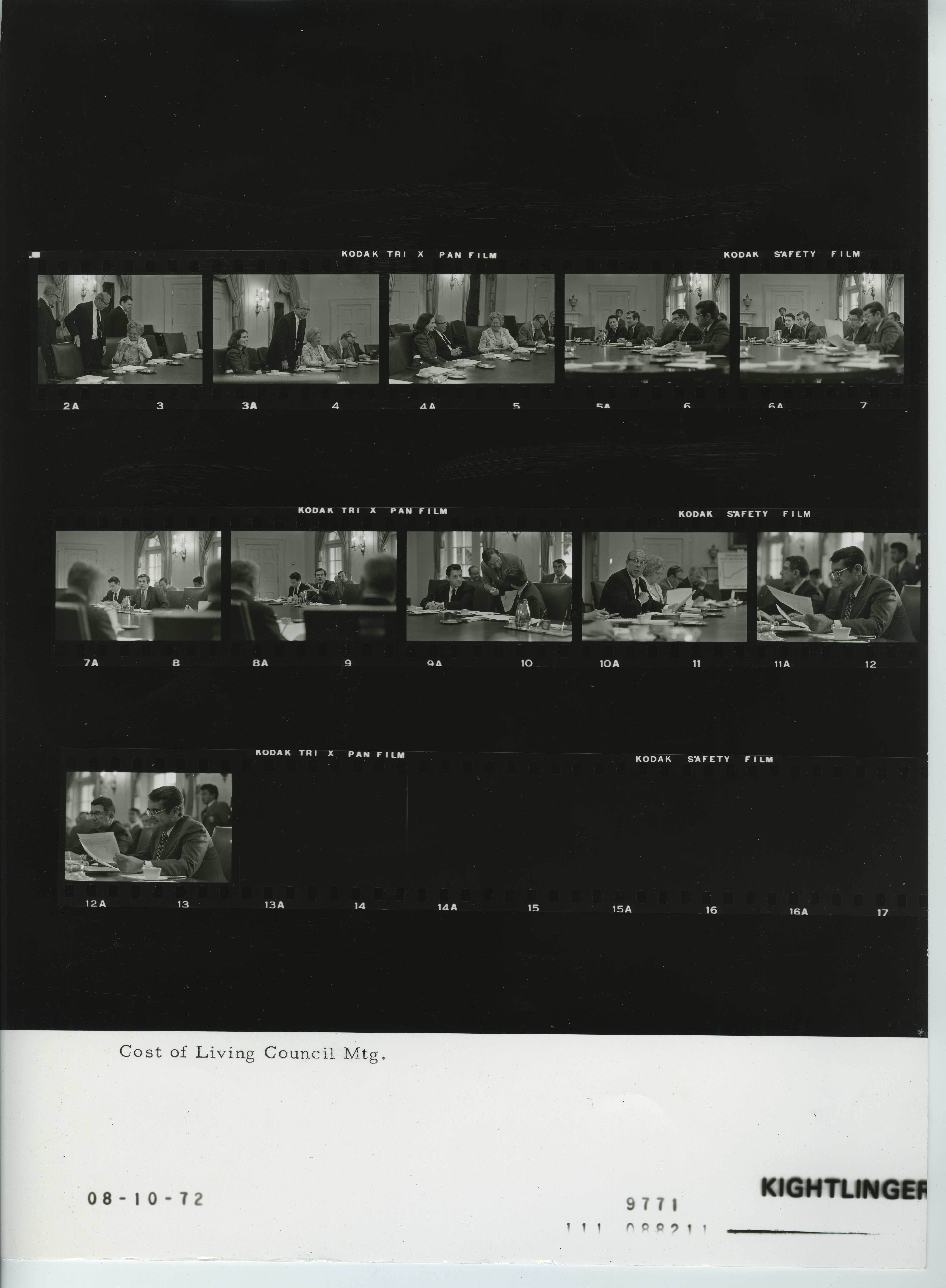 - Frame(s): WHPO-9770-07A, President Nixon meeting with the Cost of Living Council. 8/10/1972, Washington, D.C. White House, Cabinet Room. President Nixon, Herb Stein, Peter Peterson, J. Philip Campbell, George Shultz, Virginia Knauer, Laurence Silberman, George A. Lincoln, Weinberger, Donald Rumsfeld, Richard (Dick) Cheney, Arthur Burns, James Lynn, James McLane, C. Robert Lane, Marvin H. Kosters, William I. Greener Jr., Joseph Mullaney, I.David Wheat Jr. Marina Whitman, William Walker, Ron Ziegler.