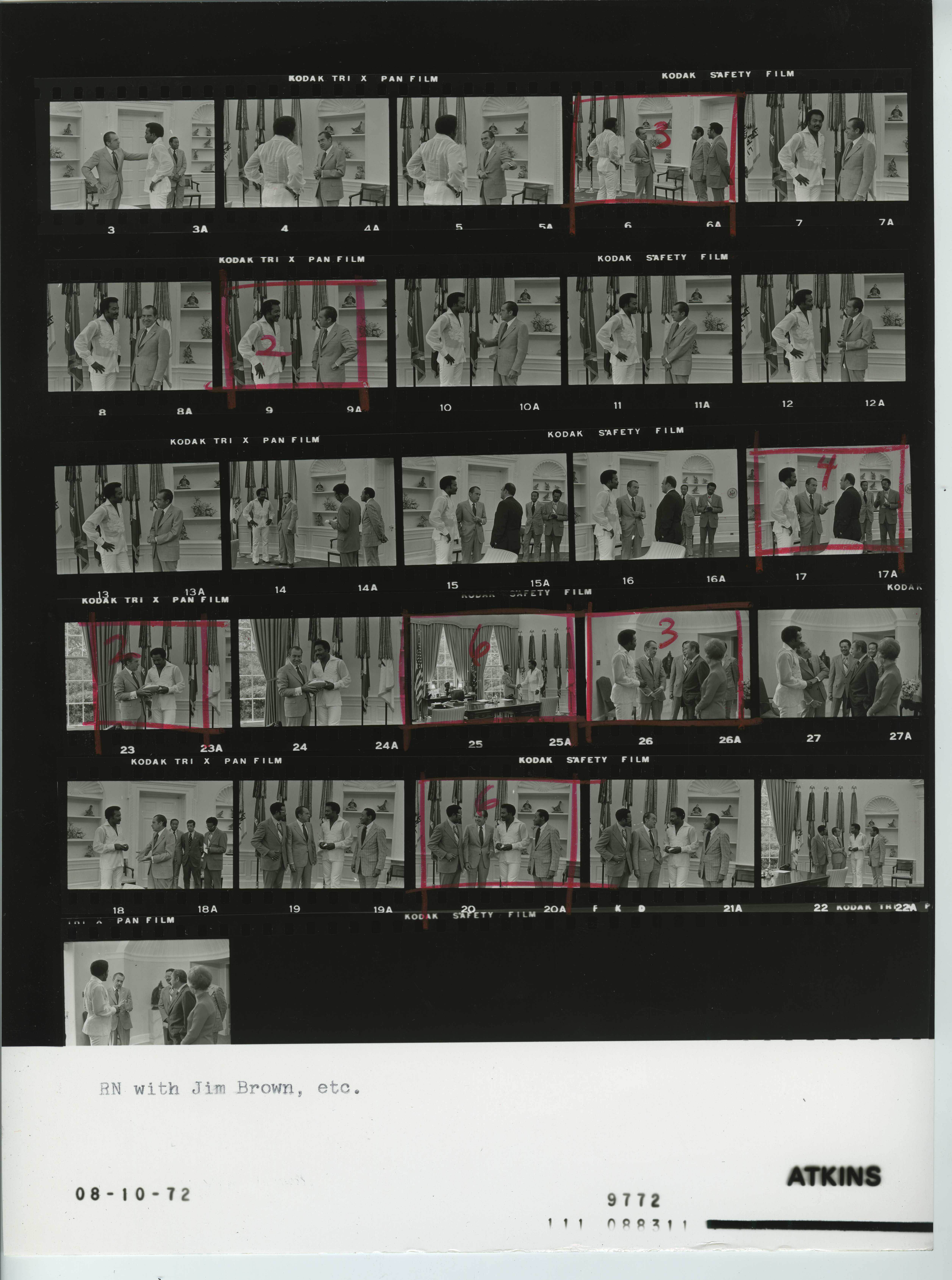 - Frame(s): WHPO-9772-20, President Nixon in the Oval Office with former football player Jim Brown, John Wilkes and Stanley Scott. 8/10/1972, Washington, D.C. White House, Oval Office. President Nixon, Jim Brown, John Wilkes, Stanley Scott.
