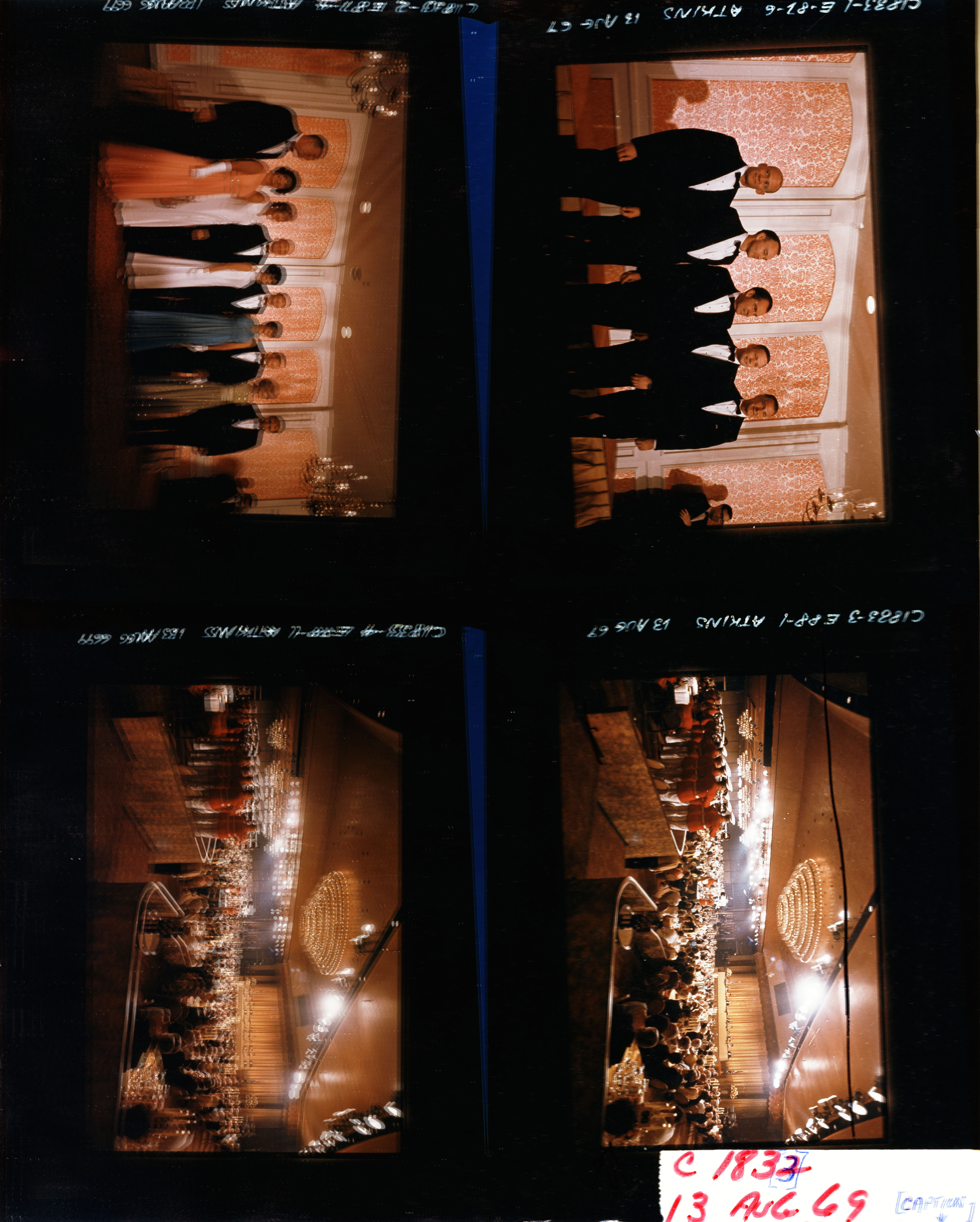 - Frame(s): WHPO-1836-00A-11A, 19A-20A, President Nixon, Pat Nixon, Julie Eisenhower, David Eisenhower, Tricia Nixon, Vice President Agnew, Judy Agnew, Neil Armstrong, Mrs. Armstrong, Michael Collins, Mrs. Collins, Edwin "Buzz" Aldrin, and Mrs. Buzz Aldrin after the black tie dinner honoring the Apollo XI (Apollo 11) astronauts. 8/13/1969, Los Angeles, California Century Plaza Hotel. President Nixon, Pat Nixon, Julie Eisenhower, David Eisenhower, Tricia Nixon, Spiro Agnew, Judy Agnew, Neil Armstrong, Mrs. Armstrong, Michael Collins, Mrs. Collins, Edwin "Buzz" Aldrin, Mrs. Aldrin, unidentified guests.