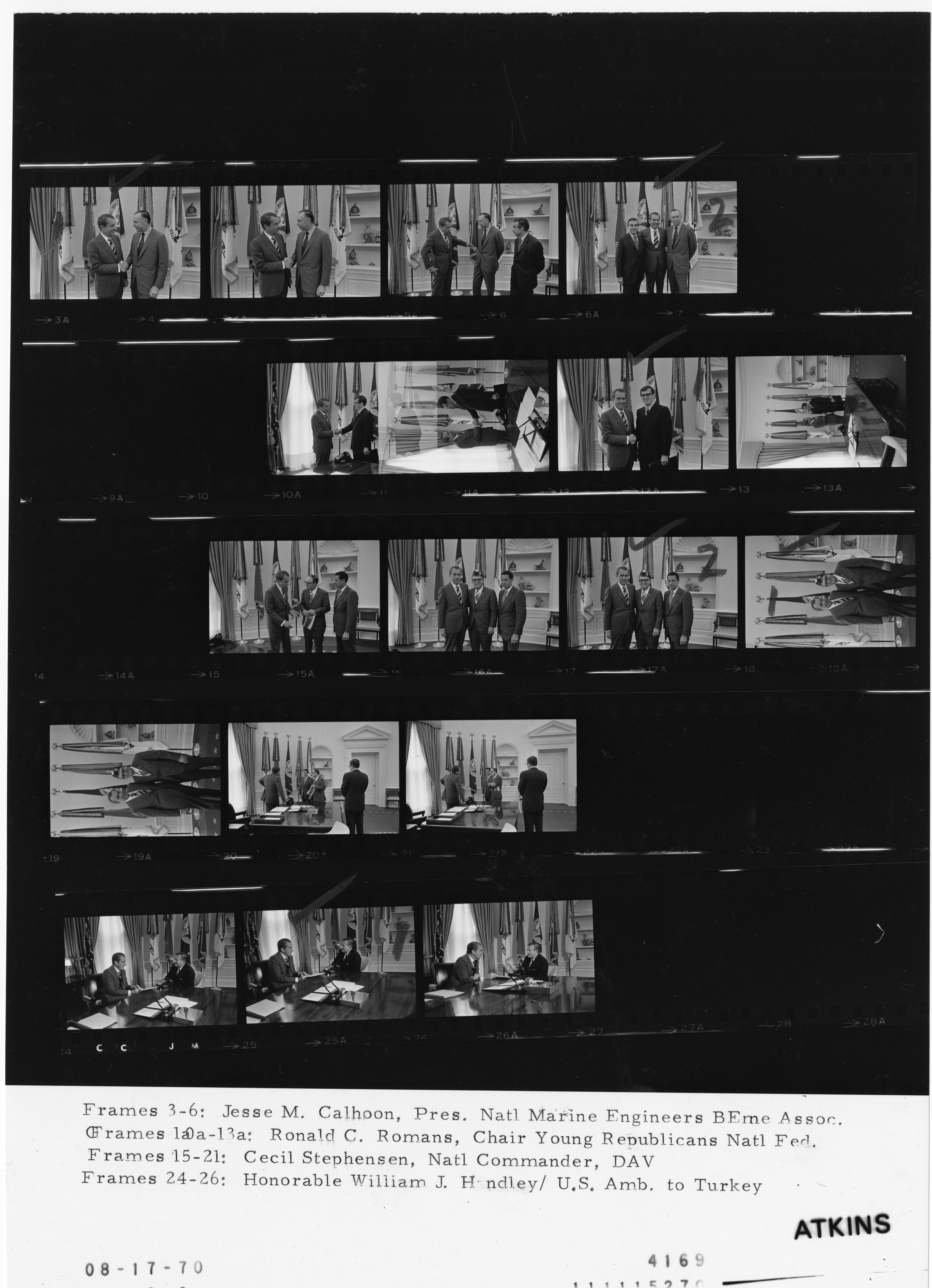 - Frame(s): WHPO-4169-24A-26A, President Nixon meeting with William Handley, U.S. Ambassador to Turkey. 8/17/1970, Washington, D.C. White House, Oval Office. President Nixon, William J. Handley.