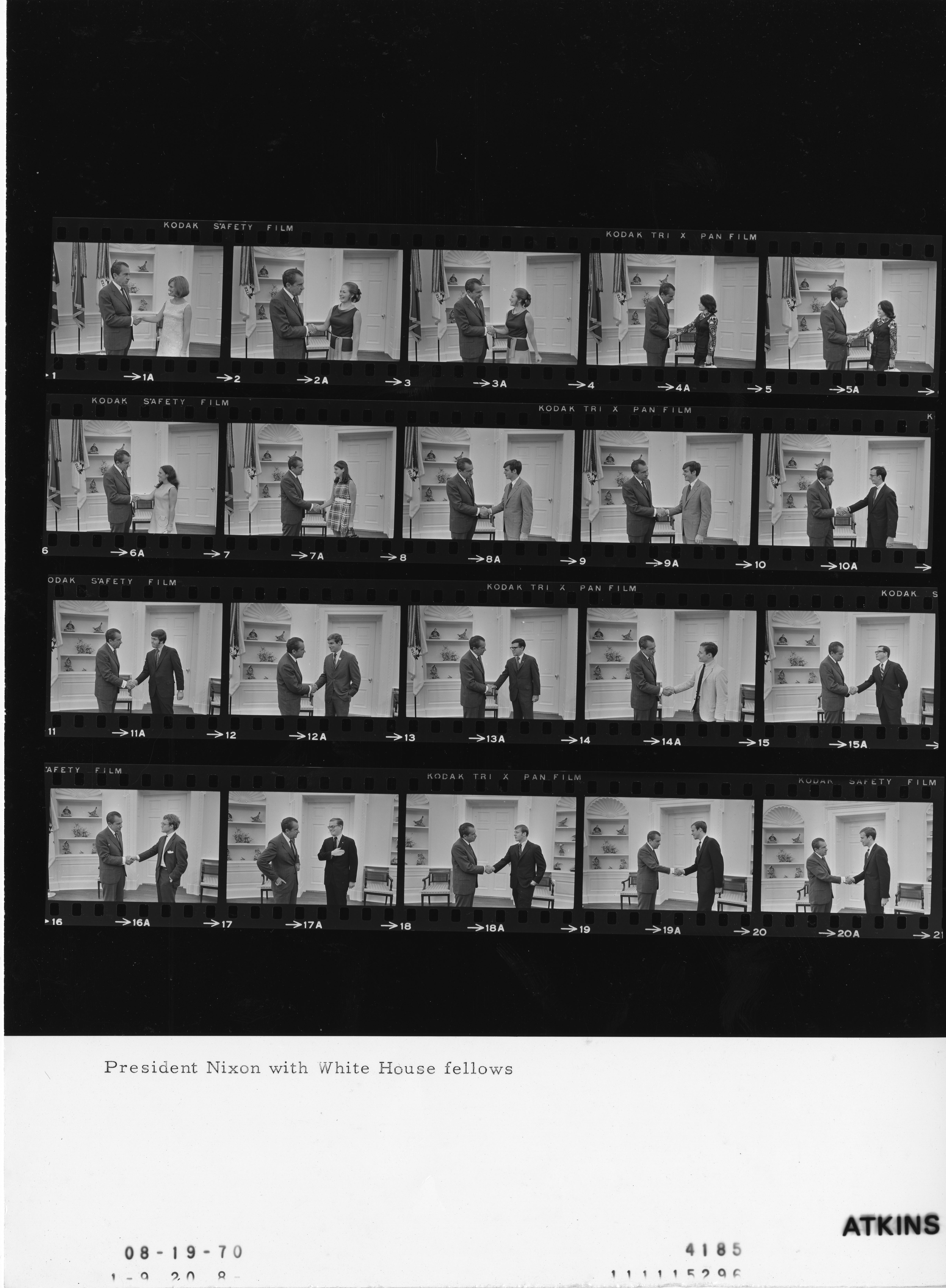 - Frame(s): WHPO-4185-01-20, President Nixon shaking hands with a summer intern from the White House Fellows program. 8/19/1970, Washington, D.C. White House, Oval Office. President Nixon, Tom Davis, Gail Gordon, Leland Hutchinson, Bill Kristol, Dolly Madison, Joan Mattingly, Bob McDermott, Jerry Milbank, Jan Milliken, Bob Niemann, Terry O'Rourke, Warren Parker, Gregg Petersmeyer, Bob Podesta, Terry Polson, Ken Smith, John Thompson (attendance not confirmed for all per Presidential Daily Diary).