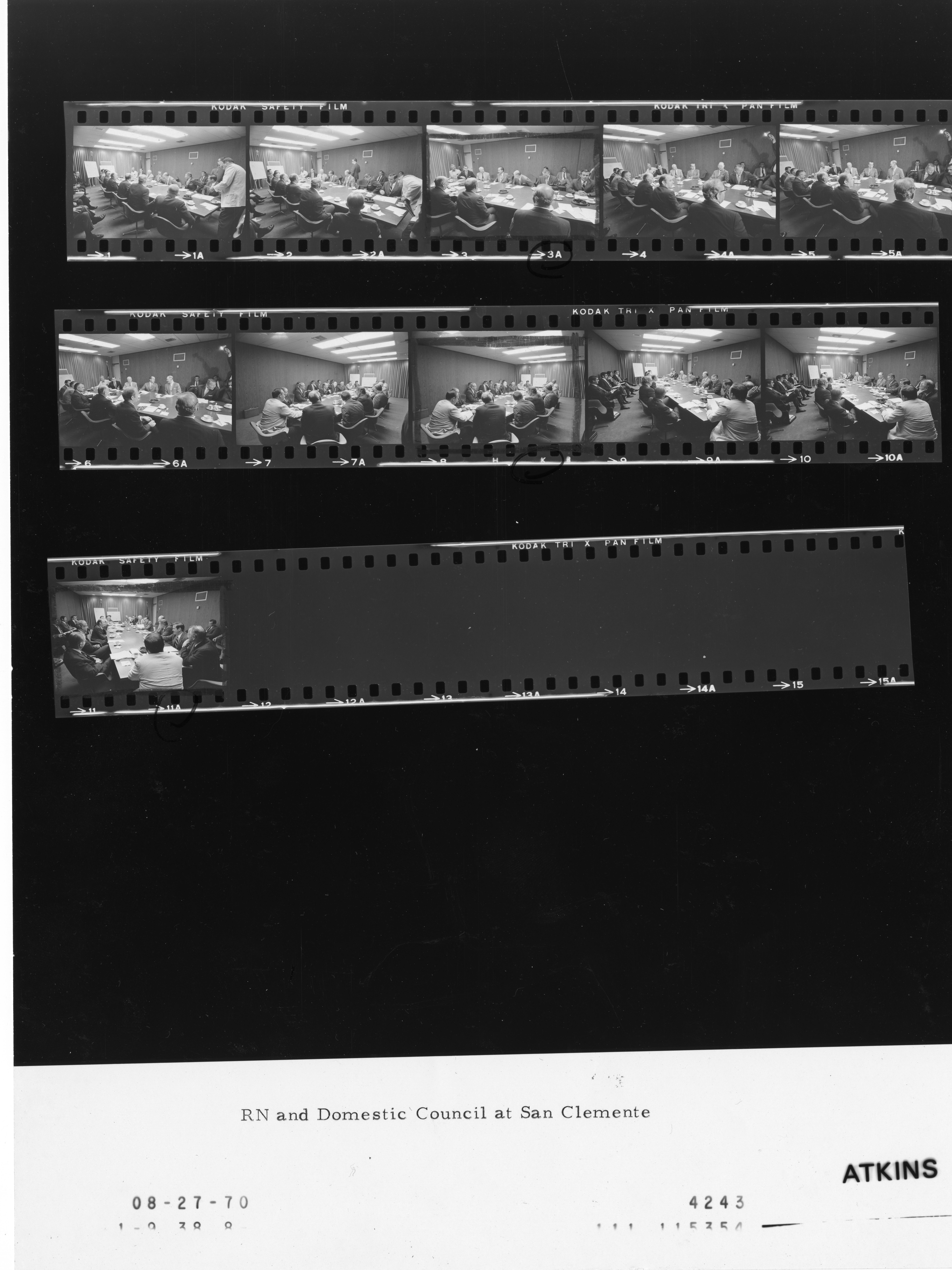 - Frame(s): WHPO-4243-01-11, President Nixon during a meeting with members of the Domestic Council at the Western White House. 8/27/1970, San Clemente, California La Casa Pacifica, Western White House. President Nixon, John Mitchell, Donald Rumsfeld, George Shultz, Daniel Moynihan, Casper Weinberger, Paul McCracken, Winton Blount.