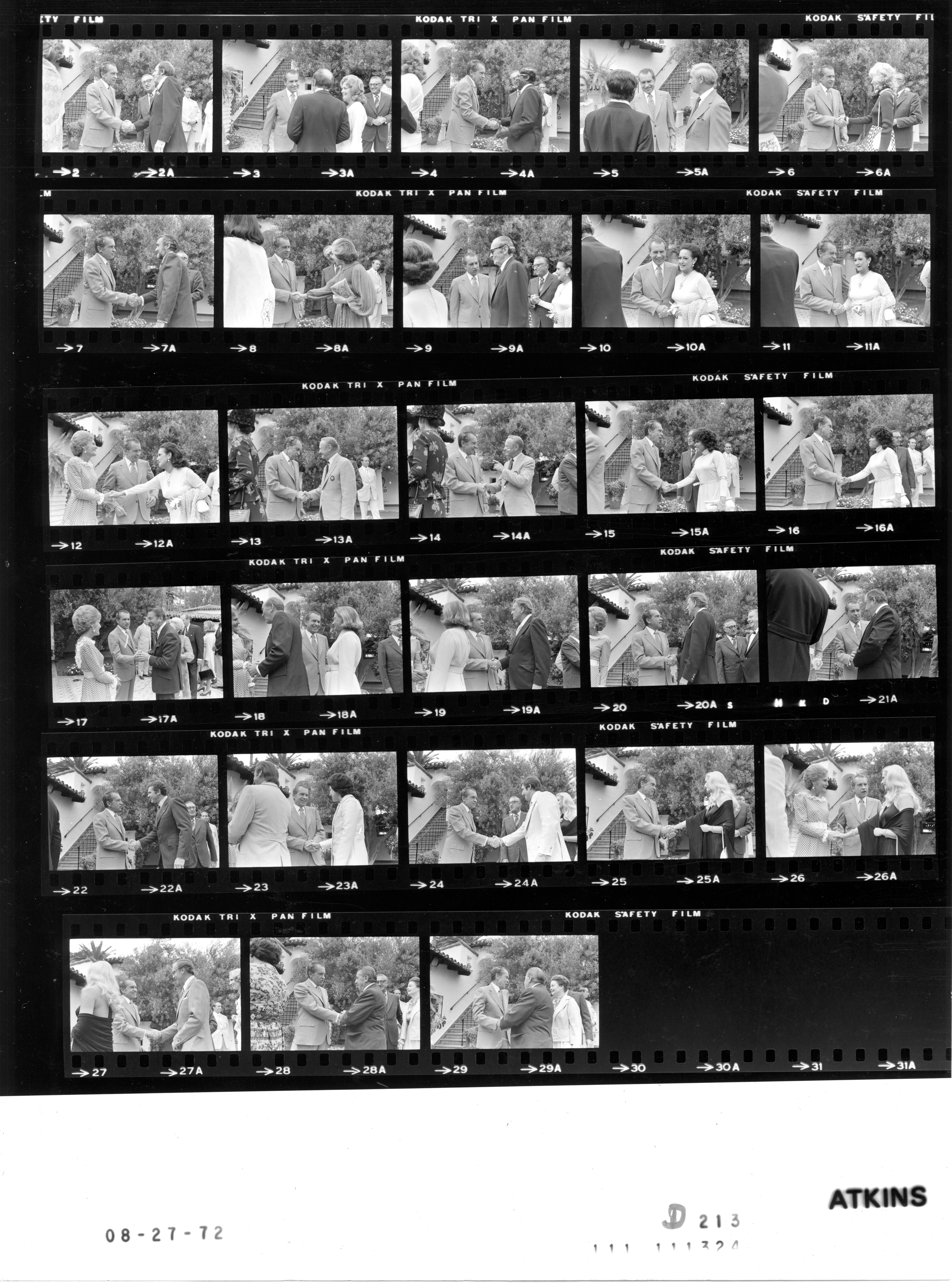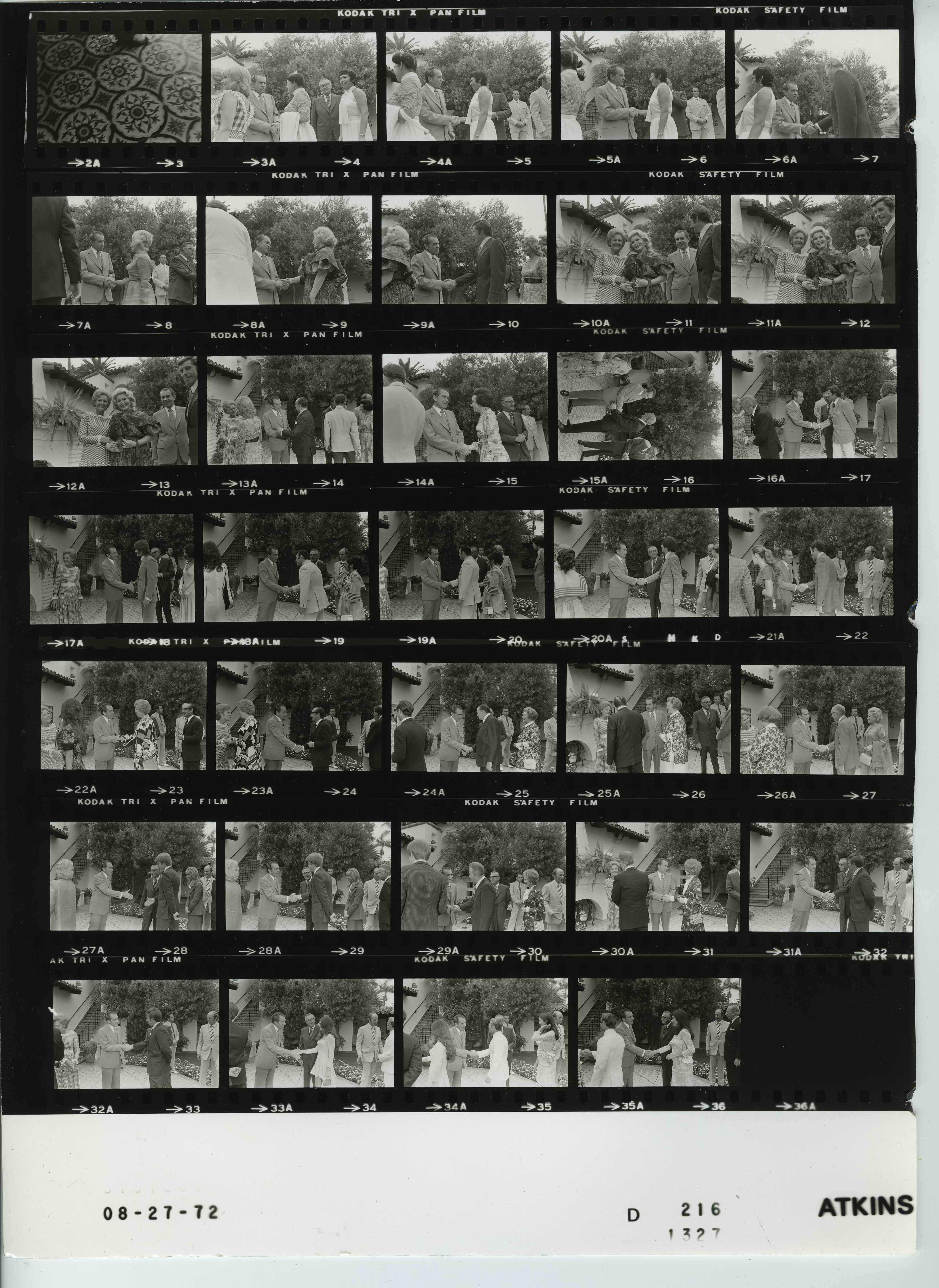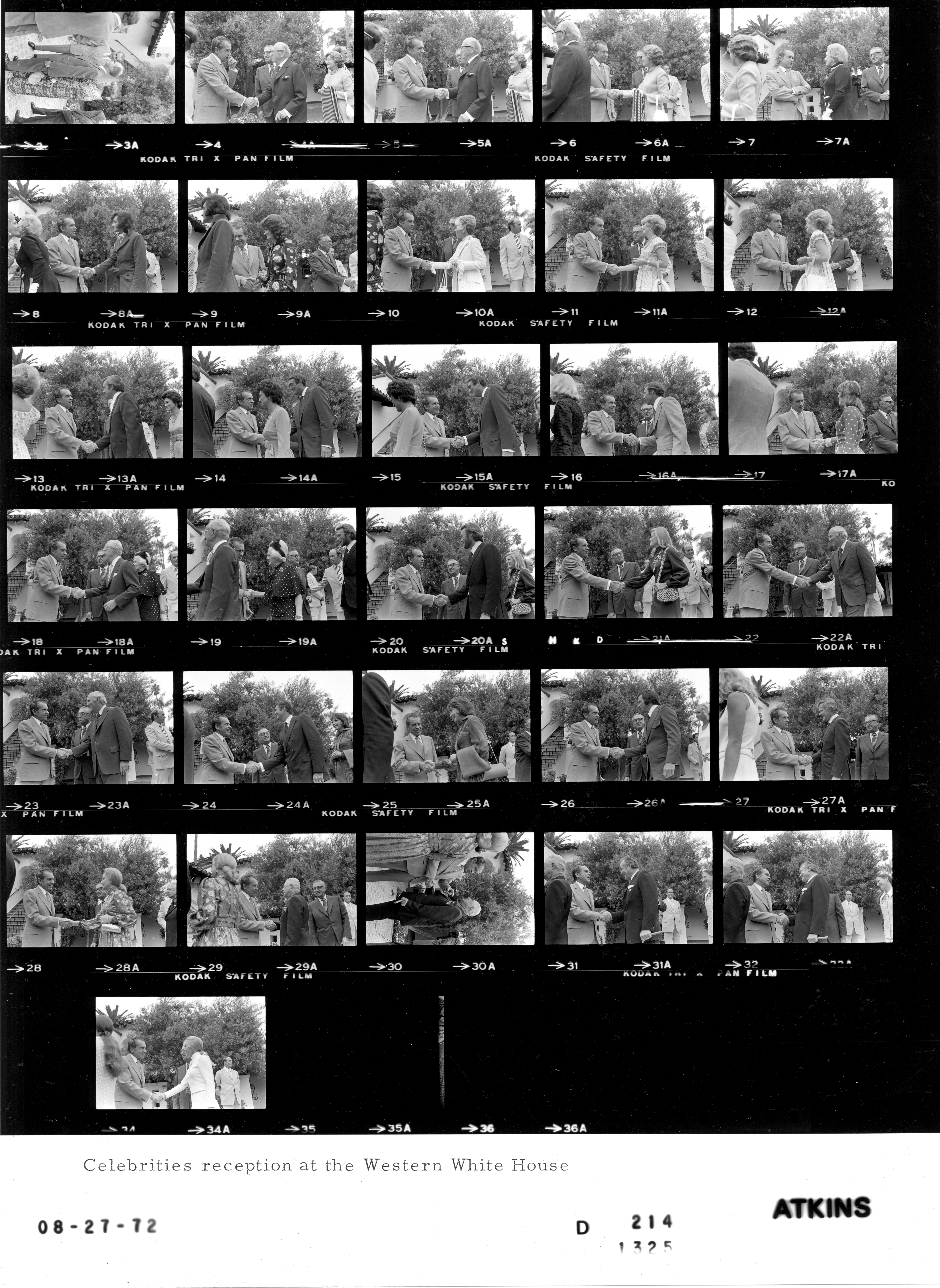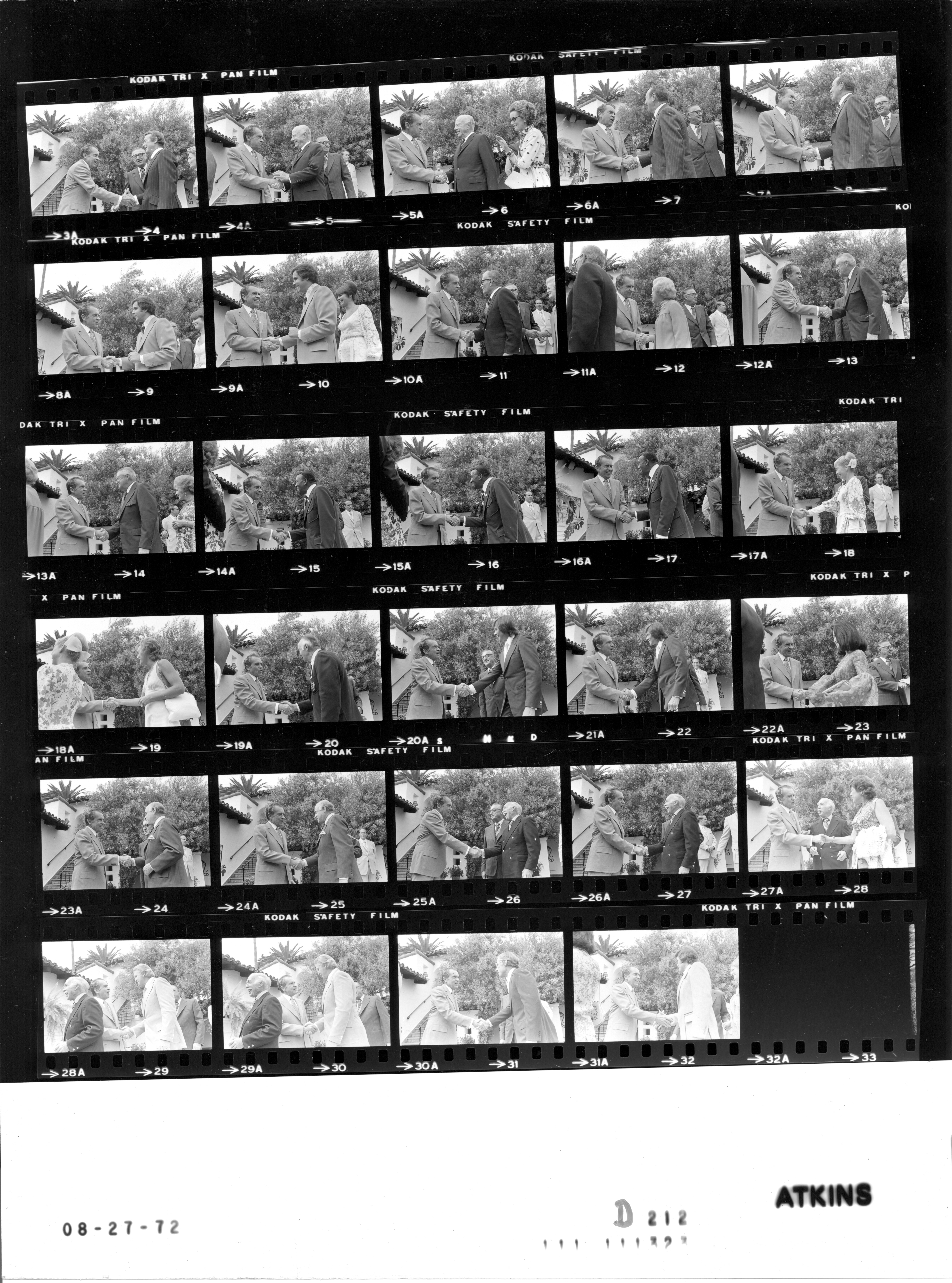 - Frame(s): WHPO-D0235-, President Nixon and Pat Nixon in a receiving line greeting TV, motion picture and music celebrities at Casa Pacifica during an outdoor party while WHPO photographer Ollie Atkins kneels nearby in a pink jacket taking photos. 8/27/1972, San Clemente, California Western White House, La Casa Pacifica courtyard. President Nixon, Pat Nixon, Spiro Agnew, celebrities.