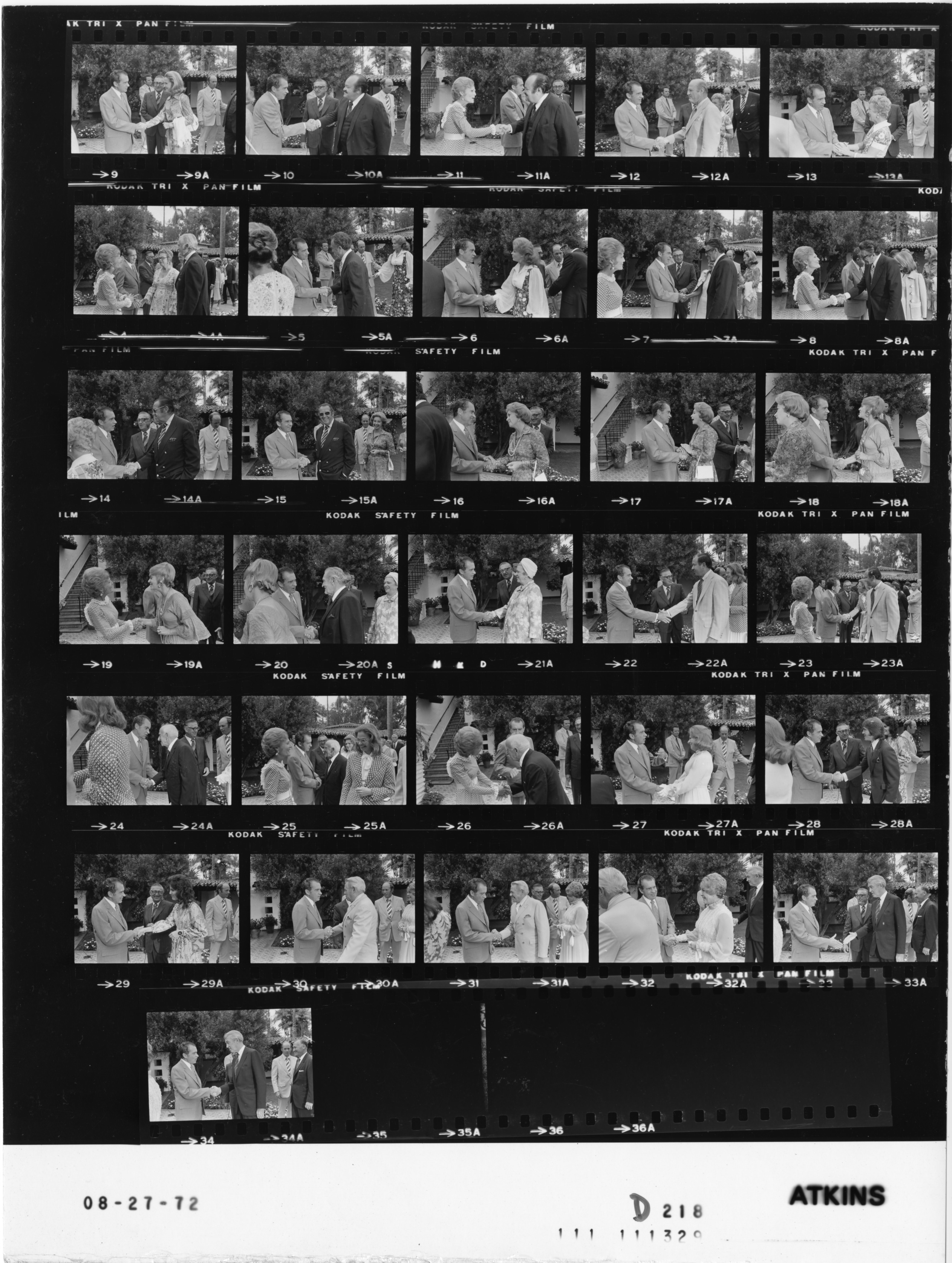 - Frame(s): WHPO-D0234-11A, President Nixon and Pat Nixon in a receiving line greeting TV celebrities (possibly Lynda Day George) at Casa Pacifica in San Clemente during an outdoor party while WHPO photographer Ollie Atkins kneels nearby in a red or pink and white jacket taking photos. 8/27/1972, San Clemente, California Western White House, La Casa Pacifica courtyard. President Nixon, Pat Nixon, Oliver Atkins, celebrities.