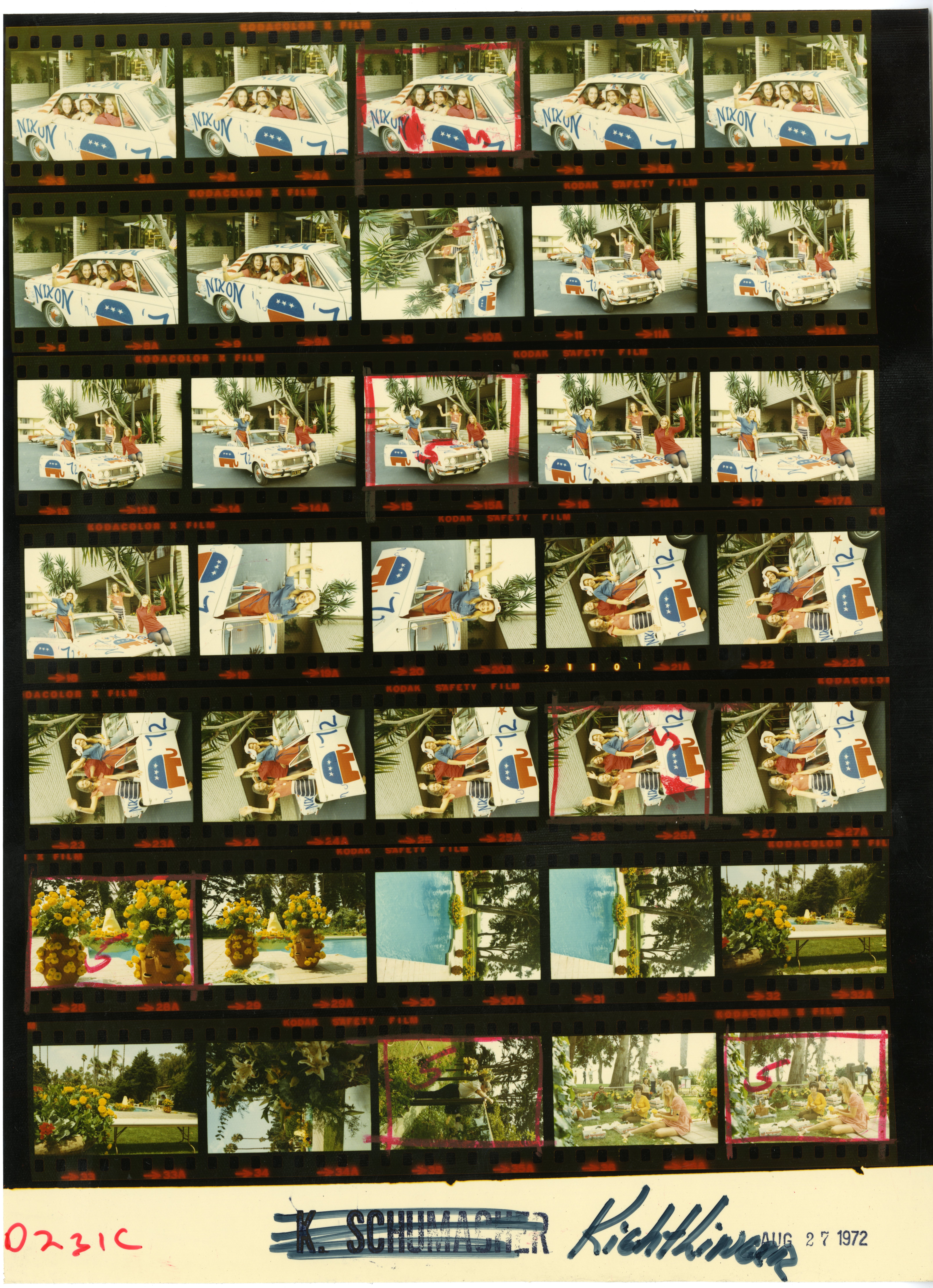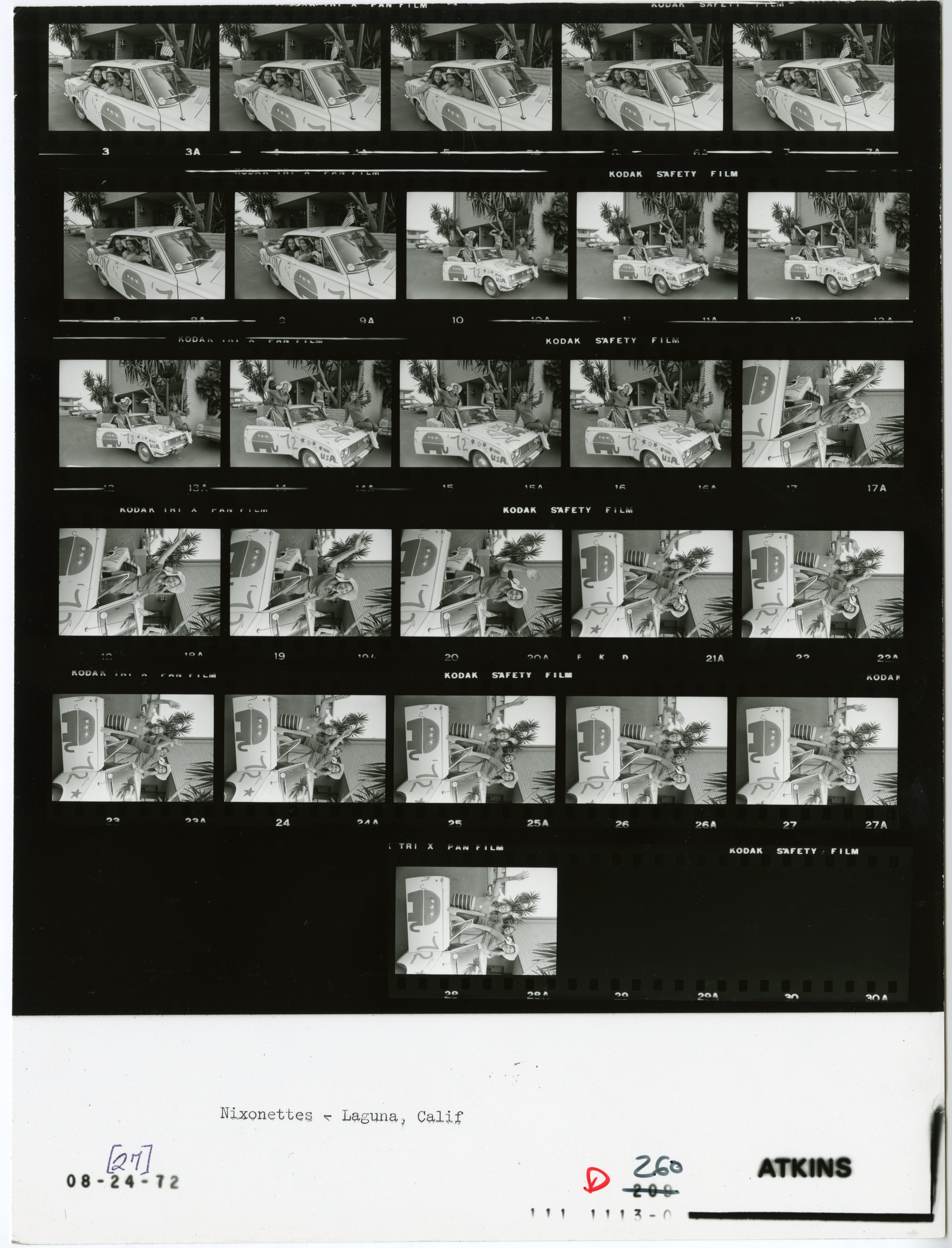 - Frame(s): WHPO-D0231-03-27, Three young ladies in a car decorated for President Nixon's re-election. 8/27/1972, Laguna, San Clemente, California street. unidentified persons.