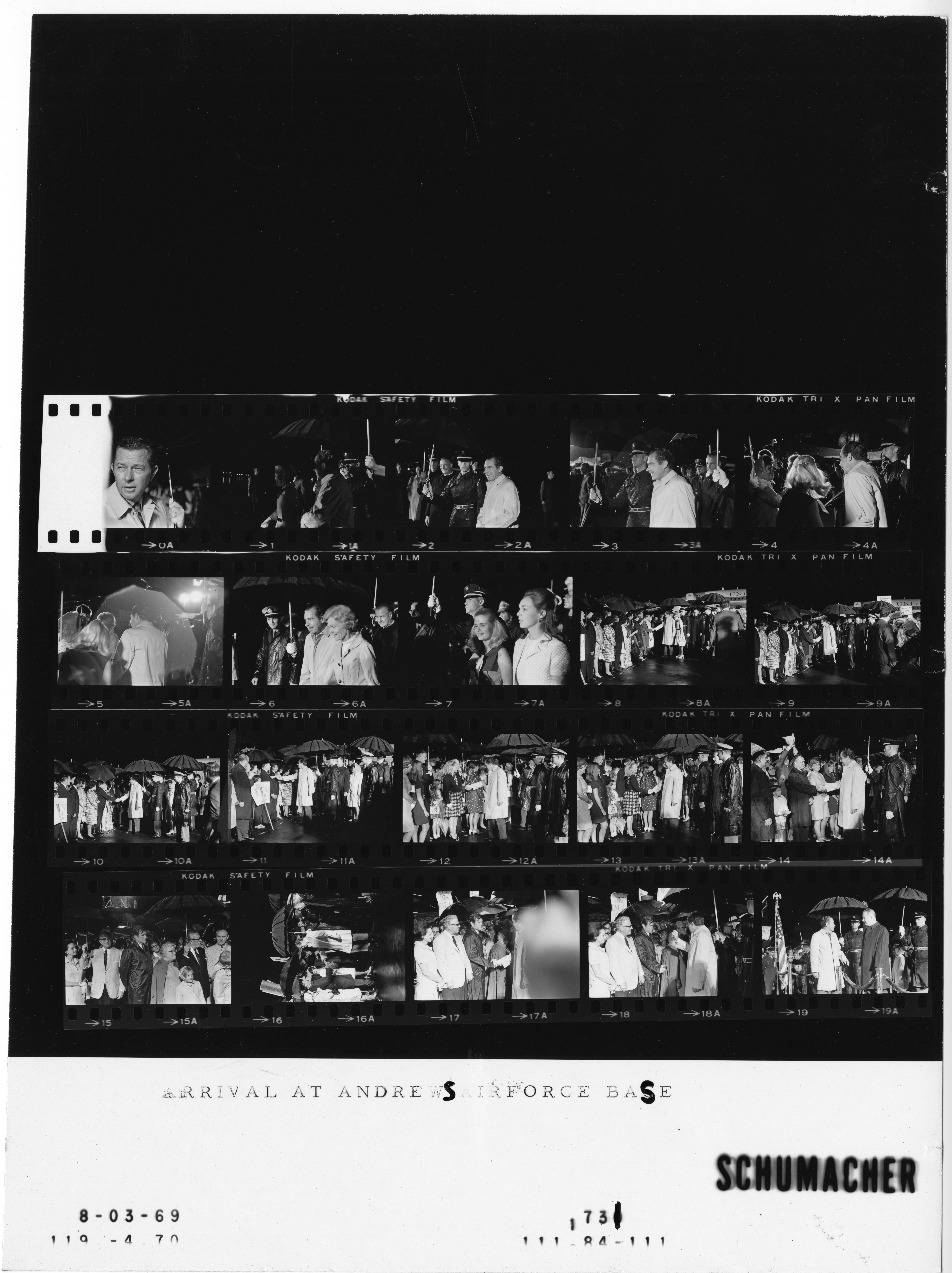- Frame(s): WHPO-1731-00A, Closeup of HEW Secretary Robert Finch holding an umbrella during the Andrews Air Force Base arrival ceremony for President Nixon and Pat Nixon, returning from their Far East trip. 8/3/1969, Prince George's County, Maryland Andrews Air Force Base. President Nixon, Pat Nixon, Julie Eisenhower, Tricia Nixon, Spiro Agnew, Judy Agnew, Dirksen, Ted Kennedy, Mike Mansfield, Congressmen.