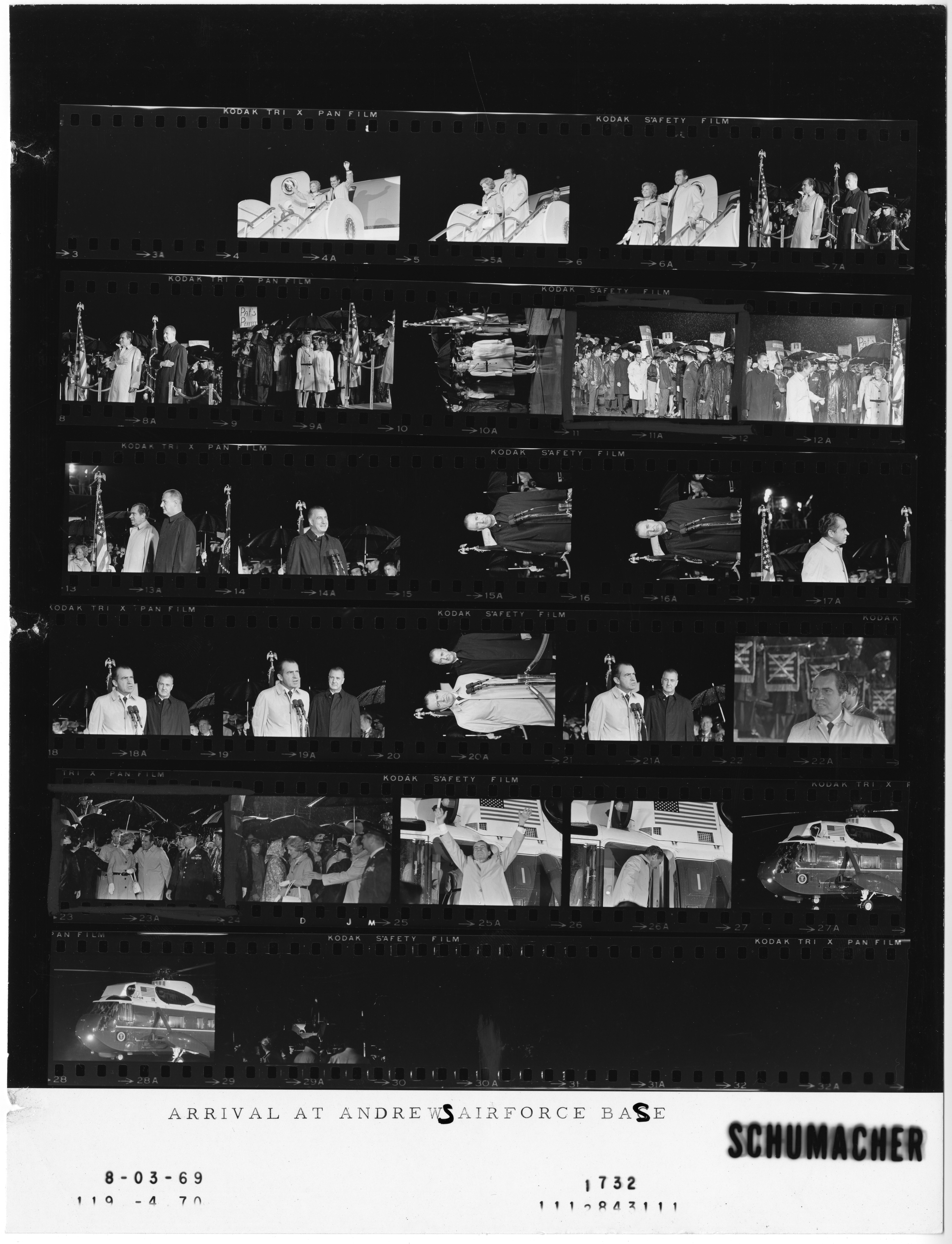 - Frame(s): WHPO-1731-08-14, President Nixon and Pat Nixon, returning from their trip to the Far East, greet unidentified officials standing in a receiving line at the Andrews Air Force Base arrival ceremony. 8/3/1969, Prince George's County, Maryland Andrews Air Force Base. President Nixon, Spiro Agnew, Judy Agnew, unidentified officials and military aides.