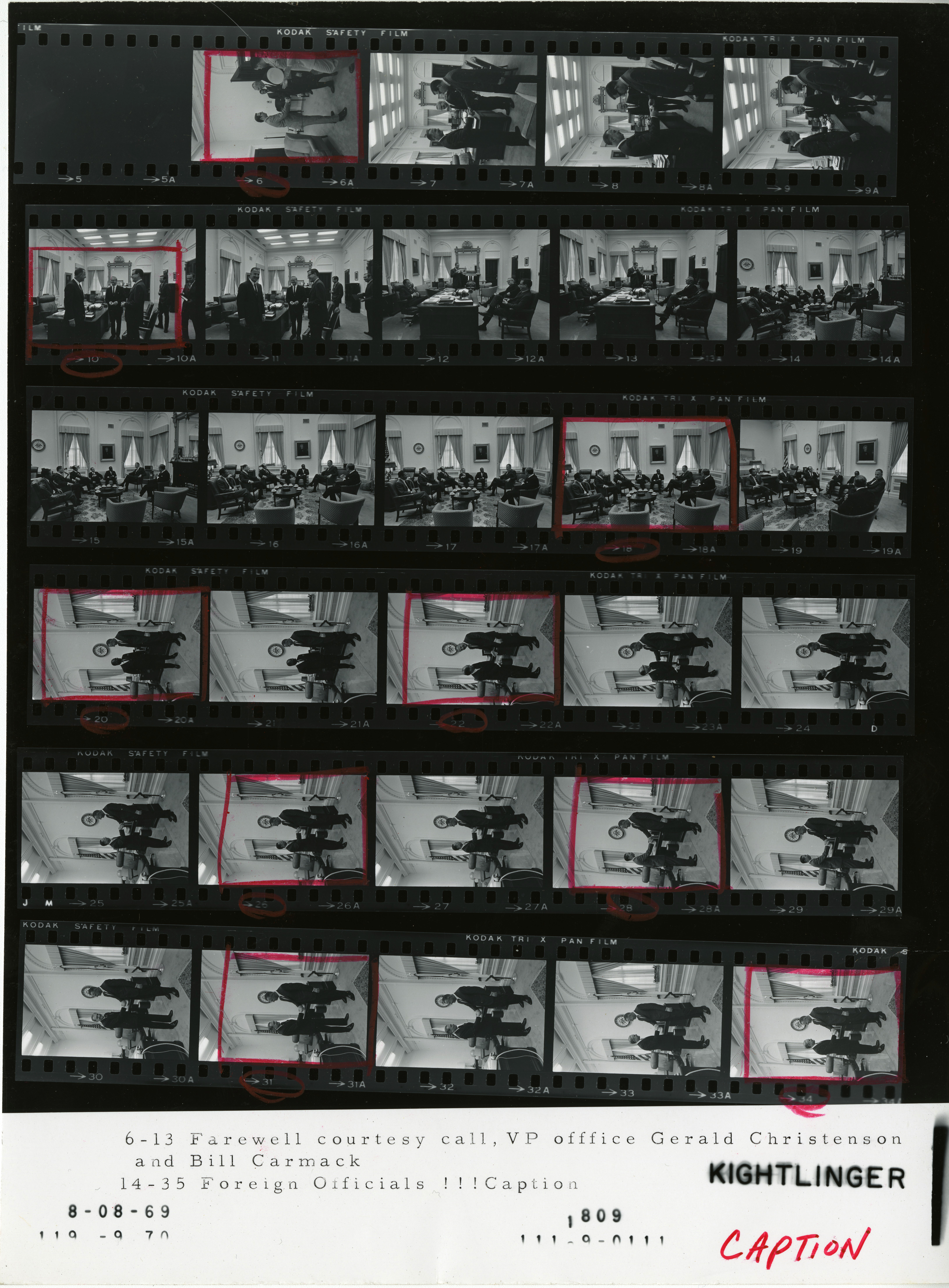 - Frame(s): WHPO-1809-06-35, Vice President Agnew receiving courtesy calls. 8/8/1969, Washington, D.C. Executive Office Building, Vice Presidential Office. Spiro T. Agnew, Kurt Kiesinger, Col. Mike Dunn, Kent Crane, Gerald Christenson, Bill Carmack, Mario Gibson Barboza, Chow Shu-Kai, S. Edward Peal, Tan Sri Ong Yoke Lin, Bui Diem, John Gregoriades.