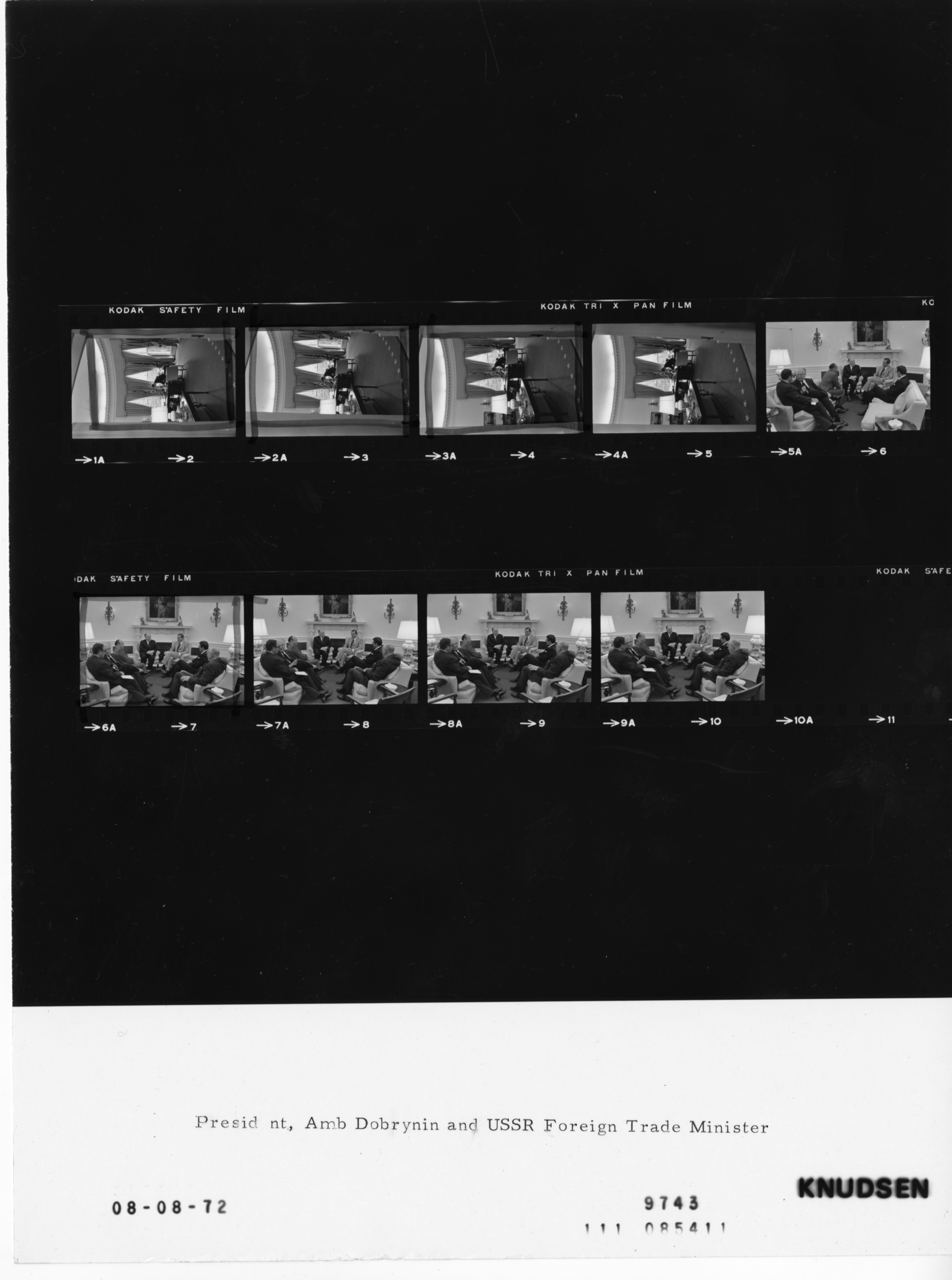 - Frame(s): WHPO-9743-05-10, President Nixon seated informally in the Oval Office during a meeting with Soviet Ambassador Anatoly Dobrynin, Boris Petrovsky (U.S.S.R. Hinister of Health), Secretary of HEW Elliot Richardson, National Security Advisor Henry Kissinger, and Consultant Roger Egeberg. 8/8/1972, Washington, D.C. White House, Oval Office. President Nixon, Anatoly Dobrynin, Boris V. Petrovsky, Elliot Richardson, Henry Kissinger, Roger Egeberg.