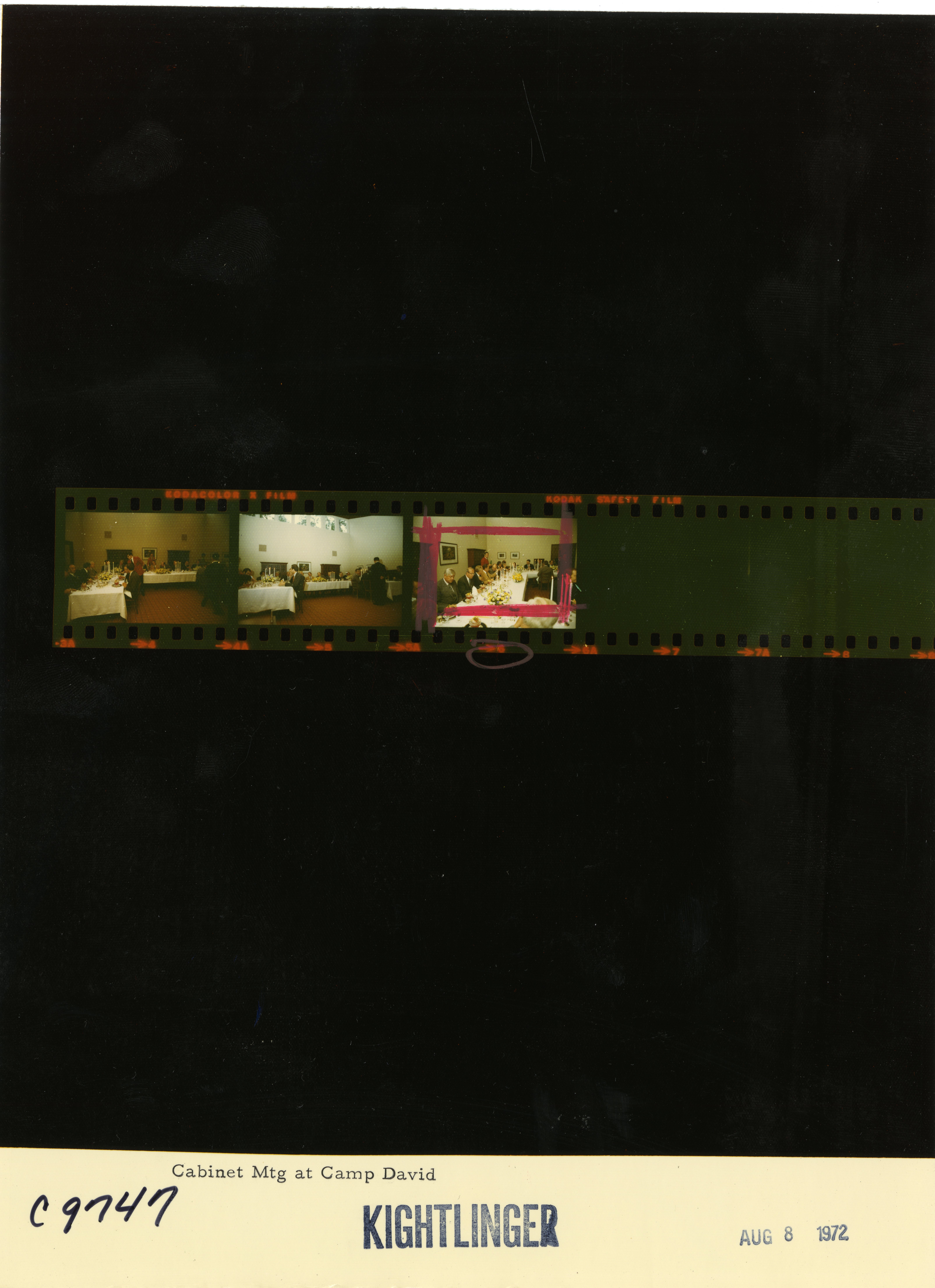- Frame(s): WHPO-9745-, A Cabinet meeting. 8/8/1972, Camp David, Maryland unknown. President Nixon, staffers, CREP officials, Cabinet secretaries.