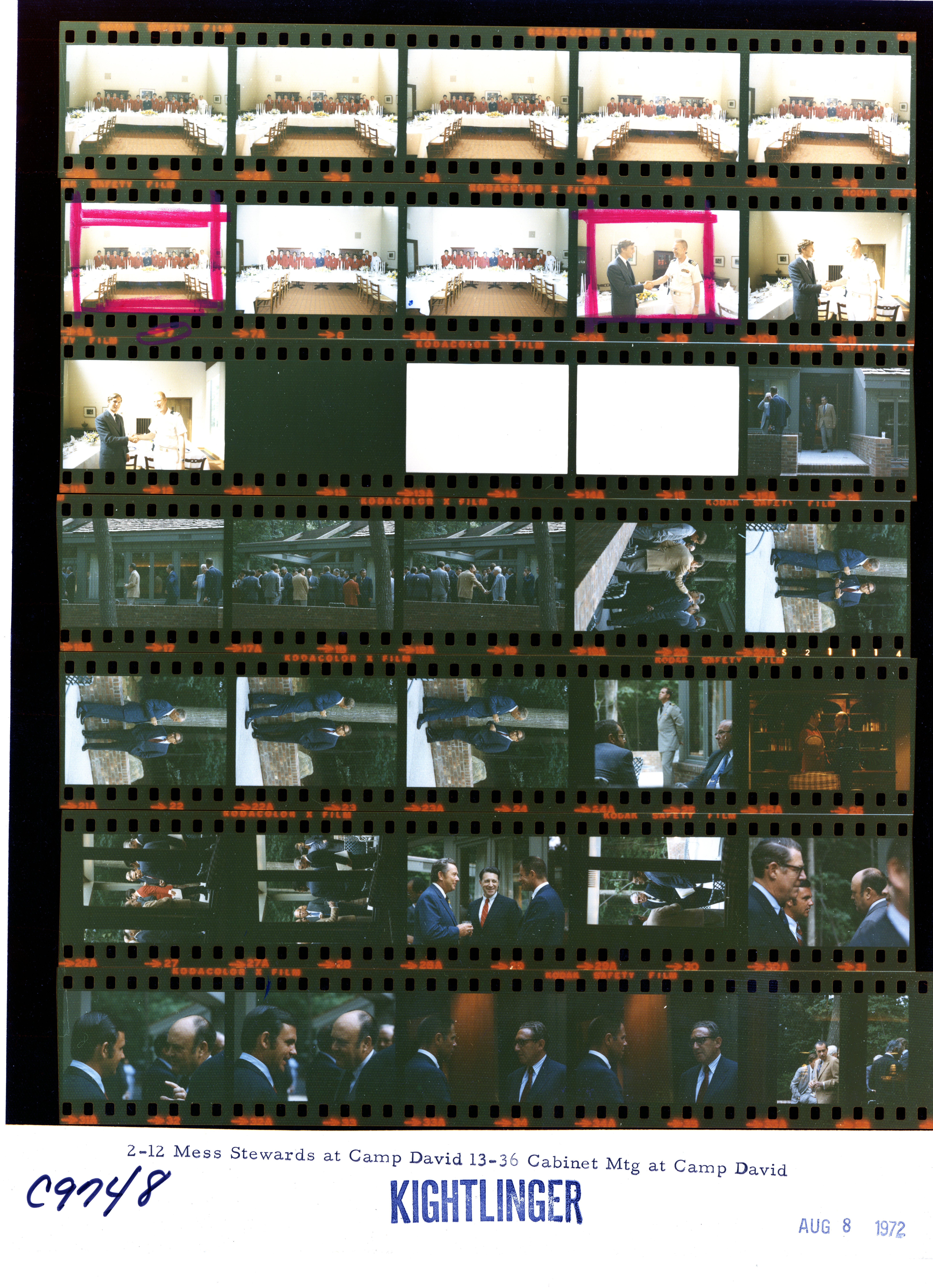- Frame(s): WHPO-9748-02-09, The kitchen or mess staff. 8/8/1972, Camp David, Maryland room, patio, Laurel Lodge. President Nixon, Cabinet members, CREP officials, staff, mess staff, unidentified man, unidentified Commander.
