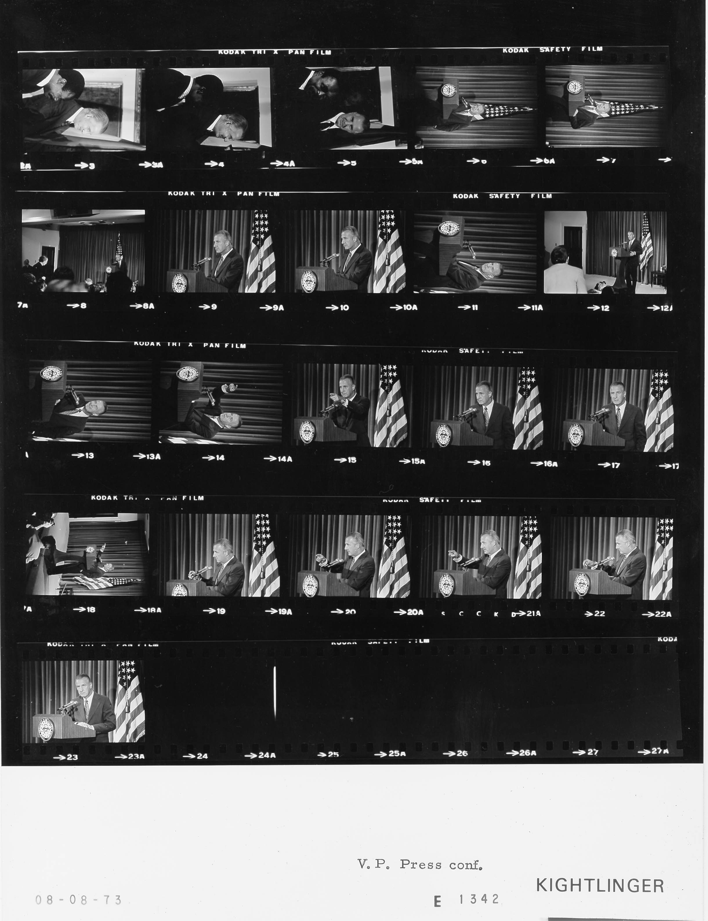 - Frame(s): WHPO-E1342-, Vice President Agnew speaking at the podium during a press conference. The Vice Presidential seal on podium. 8/8/1973, unknown.