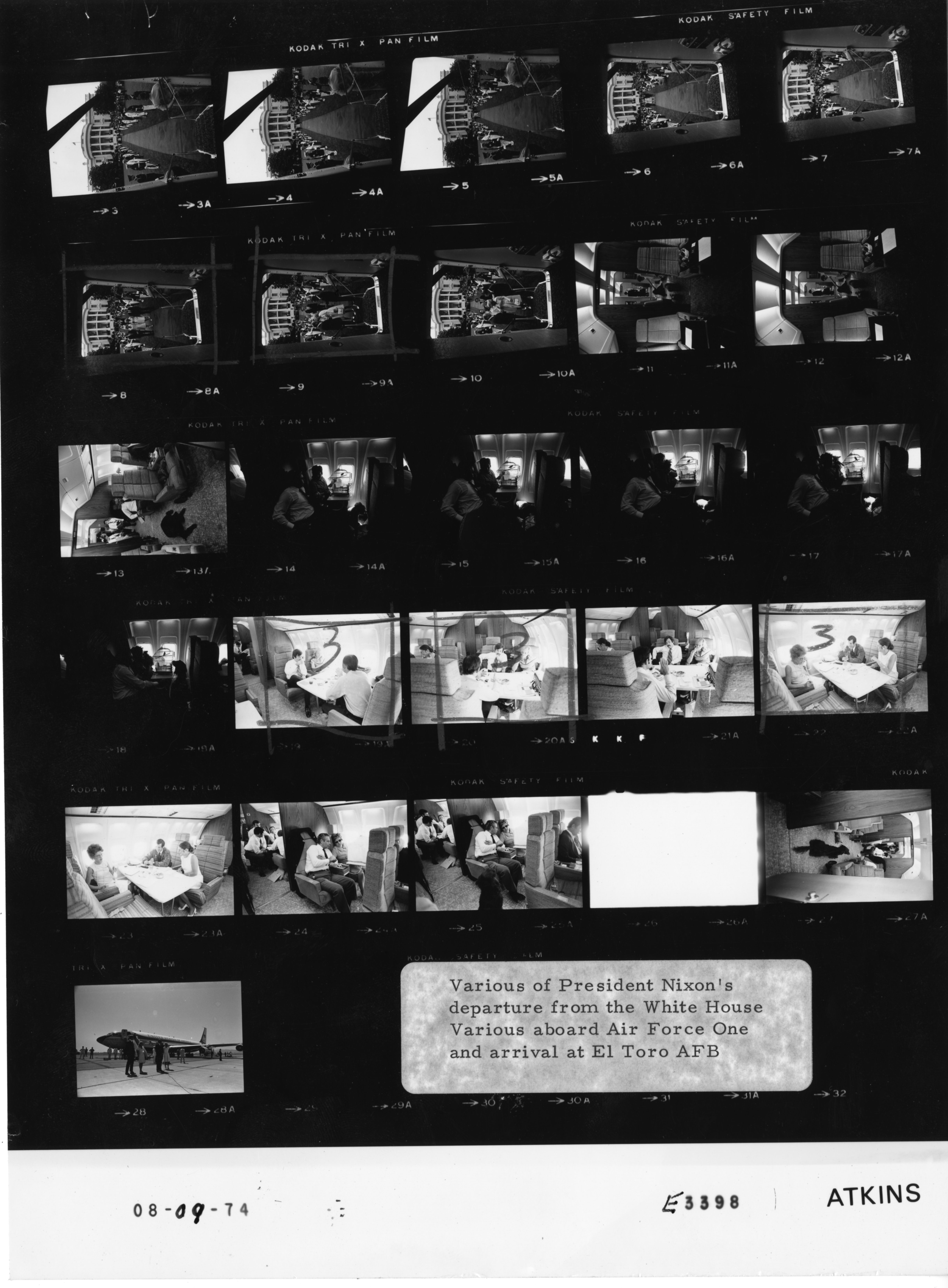 - Frame(s): WHPO-E3398-28, President Nixon speaking at the microphone set in front of Air Force One parked at El Toro Marine Corps Air Station. Pat Nixon, Tricia Nixon Cox, and Ed Cox stand nearby while secret service security agents stand near AF1 during President Nixon's last day departure to San Clemente. 8/9/1974, Andrews Air Force Base to El Toro MCAS Air Force One interior. President Nixon, Pat Nixon, Tricia Cox, Ed Cox.