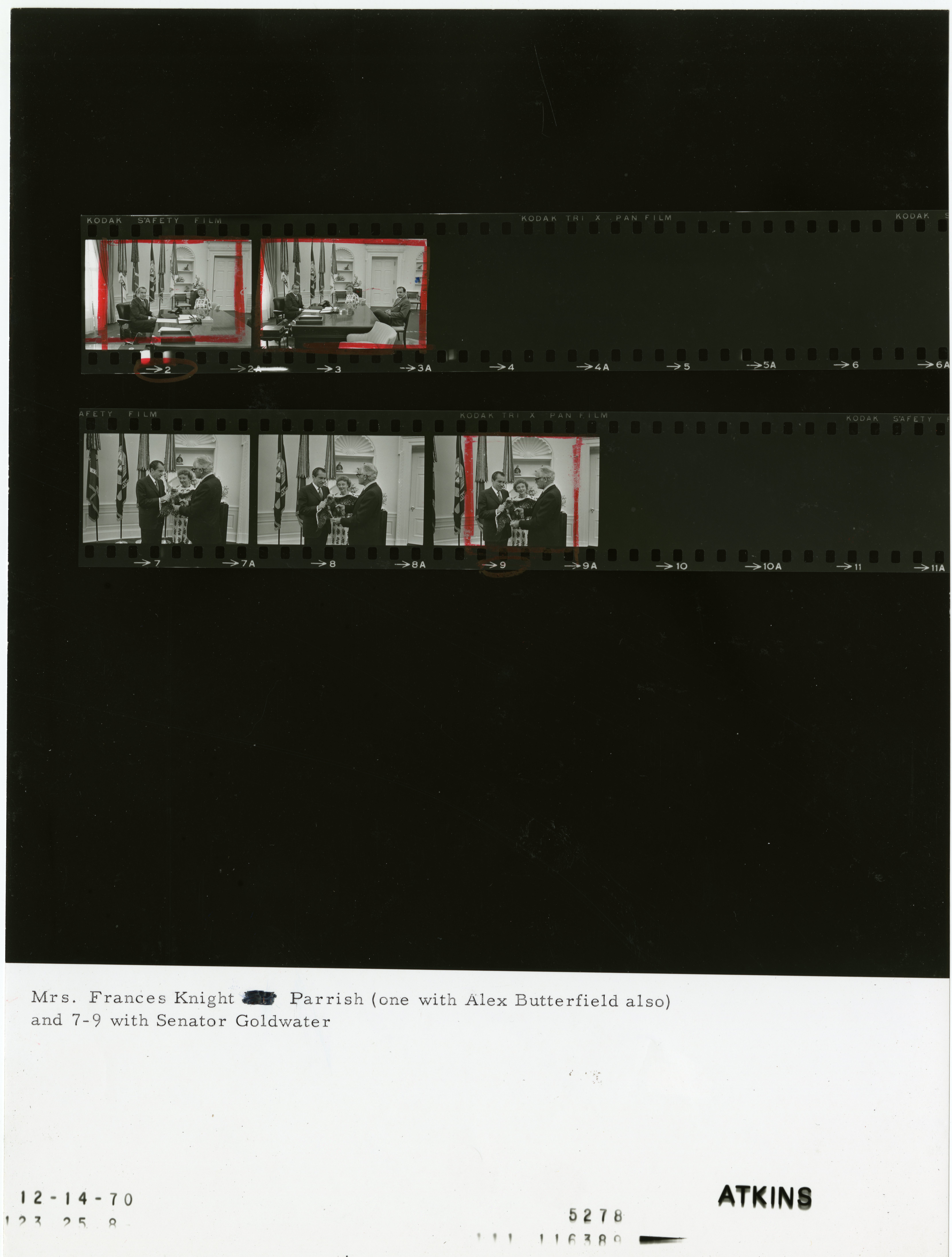 - Frame(s): WHPO-5278-02-03, President Nixon meeting with Frances Knight Parrish, Senator Goldwater. 12/14/1970, Washington, D.C. Oval Office. President Nixon, Frances Knight Parrish, Senator Goldwater.
