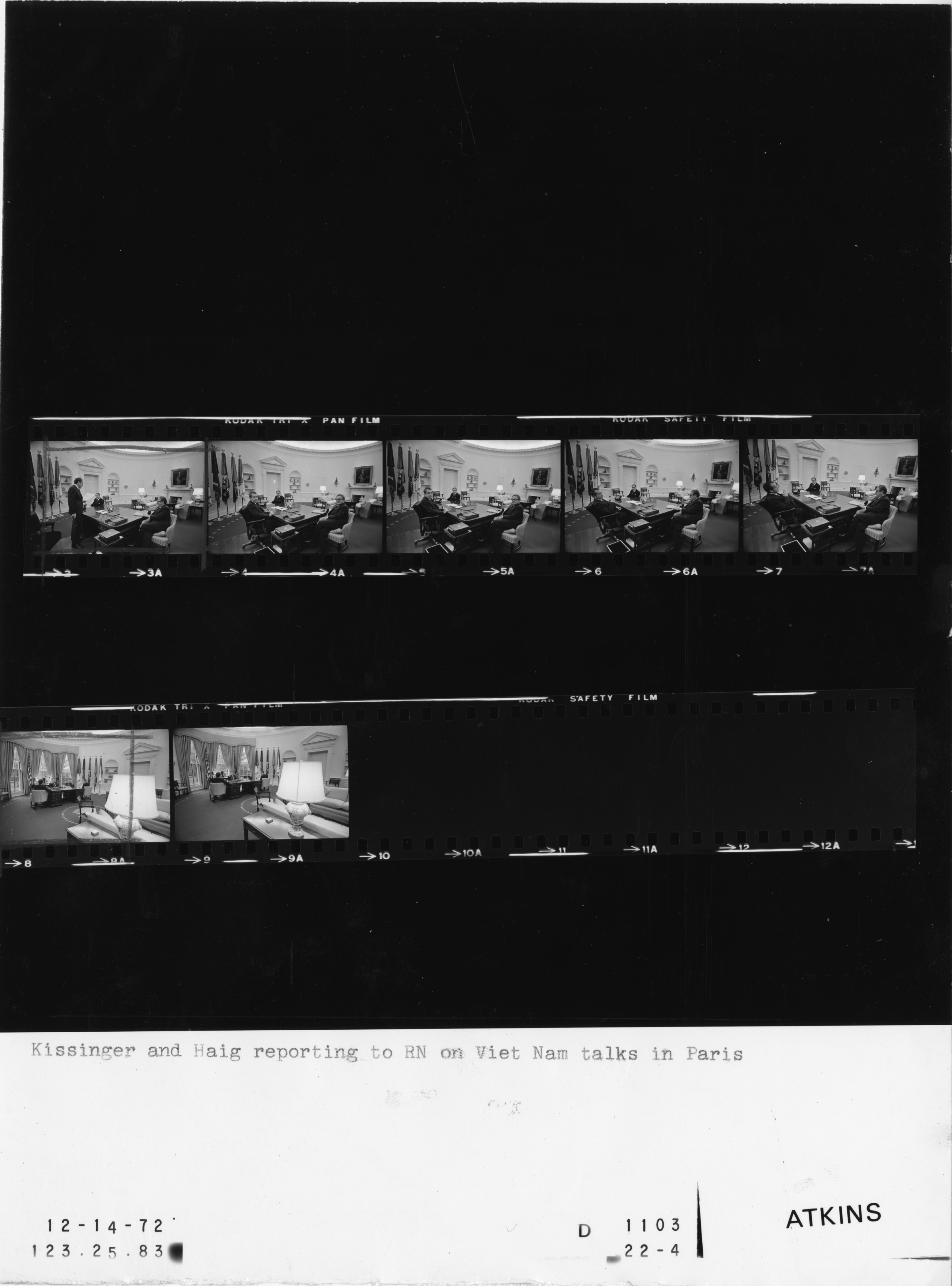 - Frame(s): WHPO-D1103-03A-09A, President Nixon seated at his Oval Office desk talking with Henry Kissinger, Assistant and Major General Alexander Haig, Jr., Deputy Assistant during an early morning meeting. 12/14/1972, Washington, D.C. White House, Oval Office. President Nixon, Henry Kissinger, Major General Alexander M. Haig, Jr..