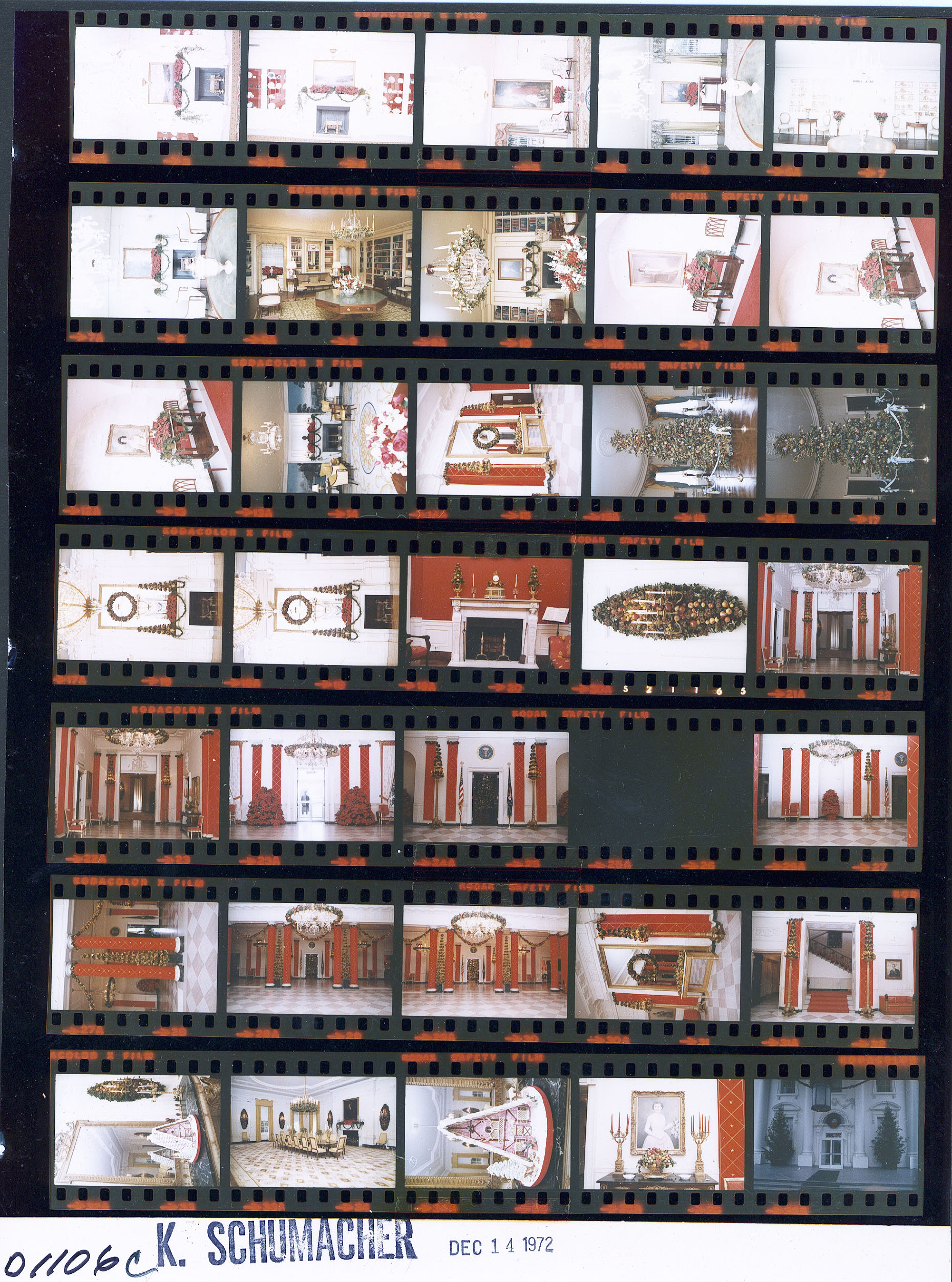 - Frame(s): WHPO-D1106-03-15, 16-34, White House interior rooms and wall in red Christmas decorations. 12/14/1972, Washington, D.C. Interior room, White House.