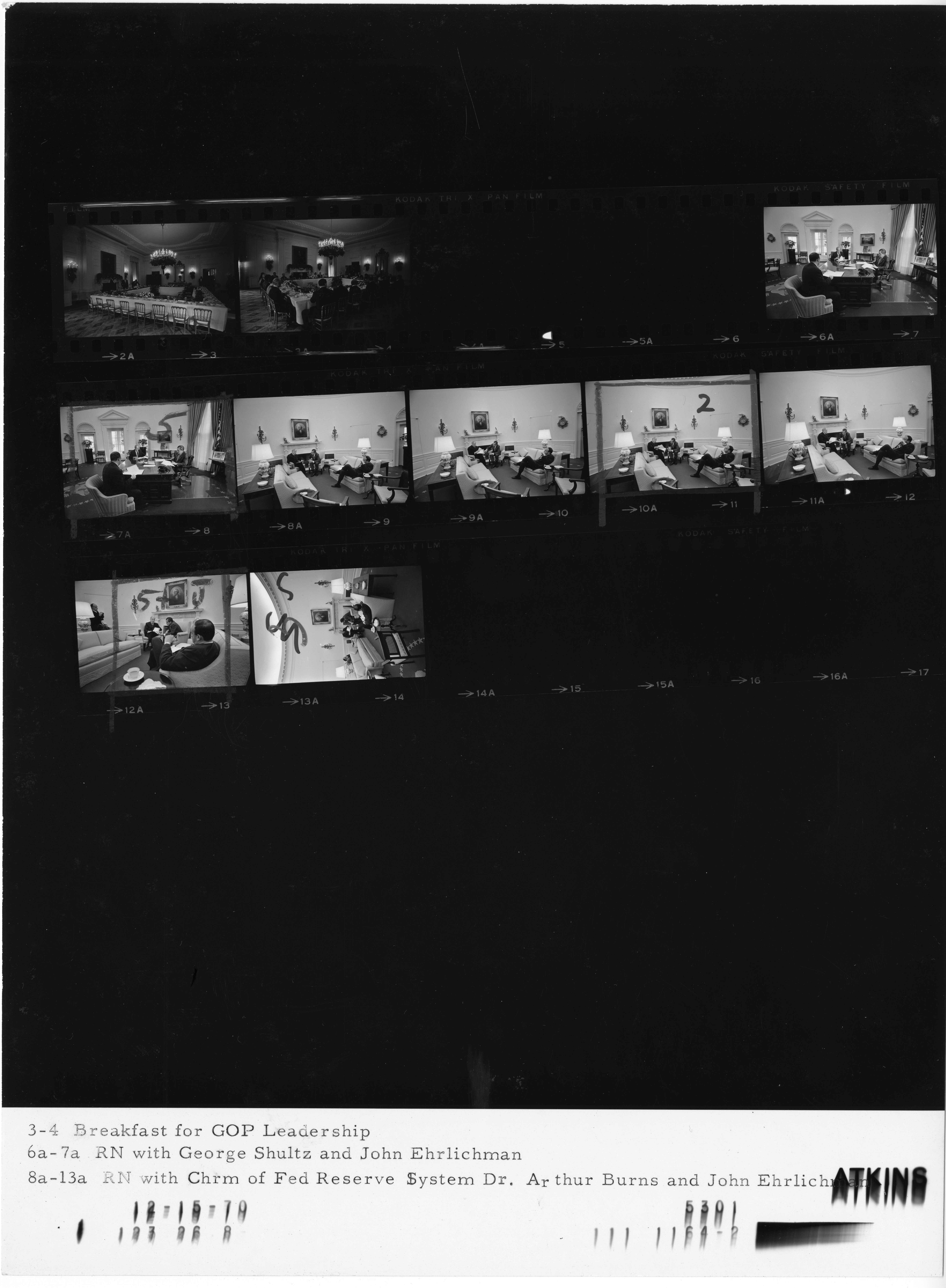 - Frame(s): WHPO-5301-08A-13A, President Nixon meeting with Federal Reserve Chairman Dr. Arthur Burns and John Ehrlichman. 12/15/1970, Washington, D.C. Oval Office. President Nixon, Dr. Arthur Burns, John Ehrlichman.