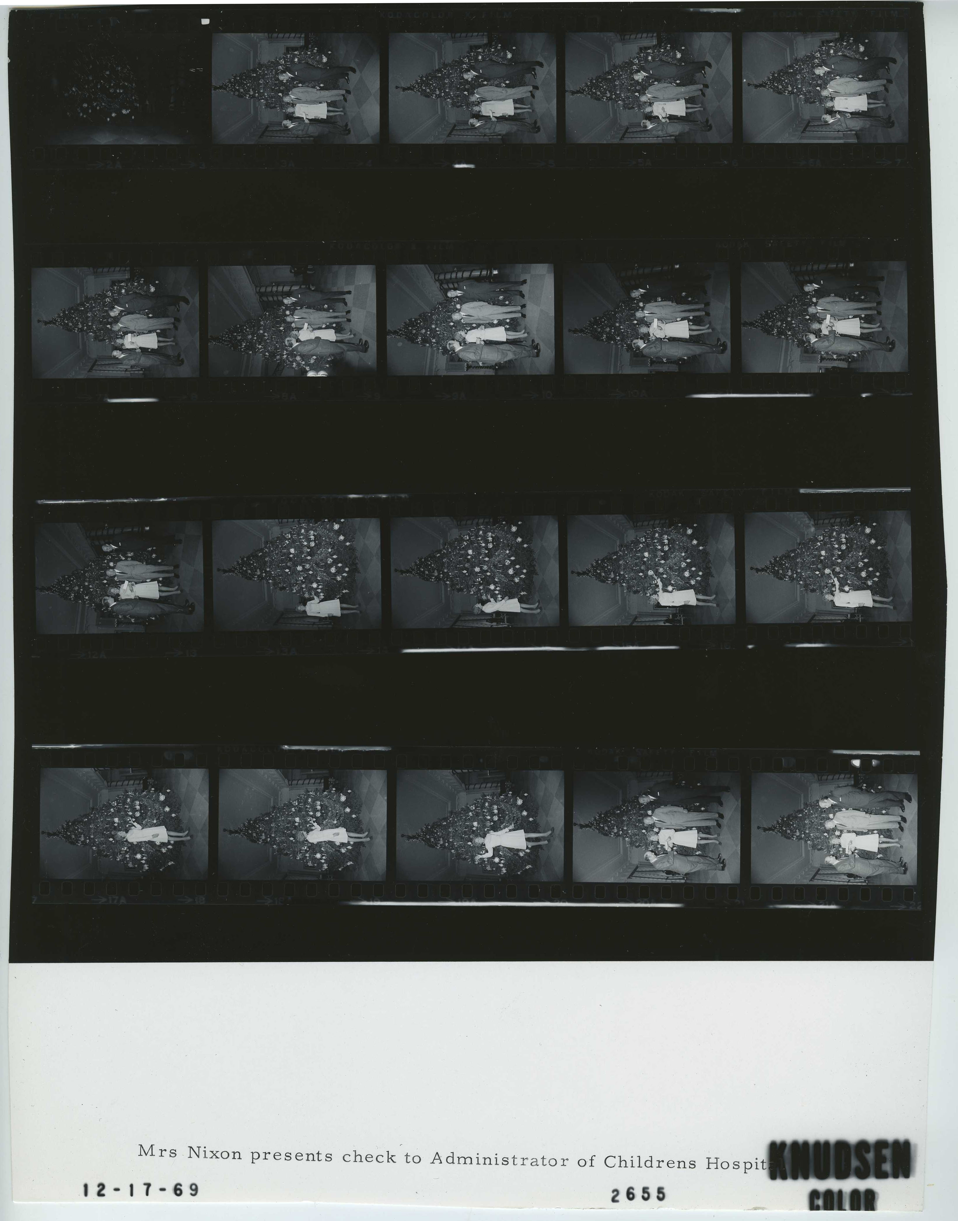 - Frame(s): WHPO-2654-02A-12A, Pat Nixon, in front of a decorated Christmas tree, presenting a check to the administrator of Children's Hospital as others watch. 12/17/1969, Washington, D.C. Grand Hall, White House. Pat Nixon, Children's Hospital officials.