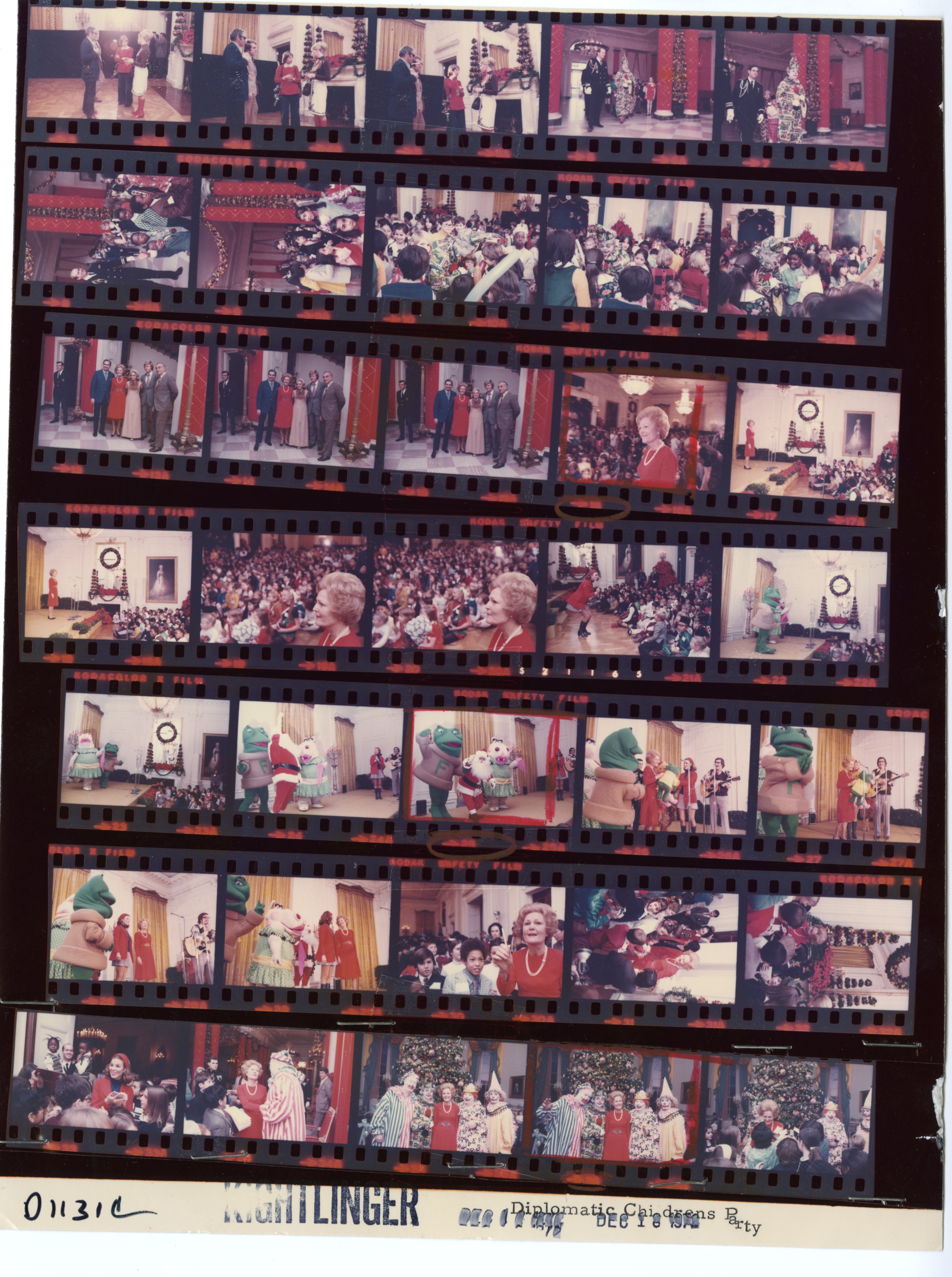 - Frame(s): WHPO-D1131-16-20, Pat Nixon attending the Diplomatic Children's Christmas Party. 12/18/1972, Washington, D.C. Grand Hallway, White House, East Room. Pat Nixon, clowns, unidentified men and women, children.
