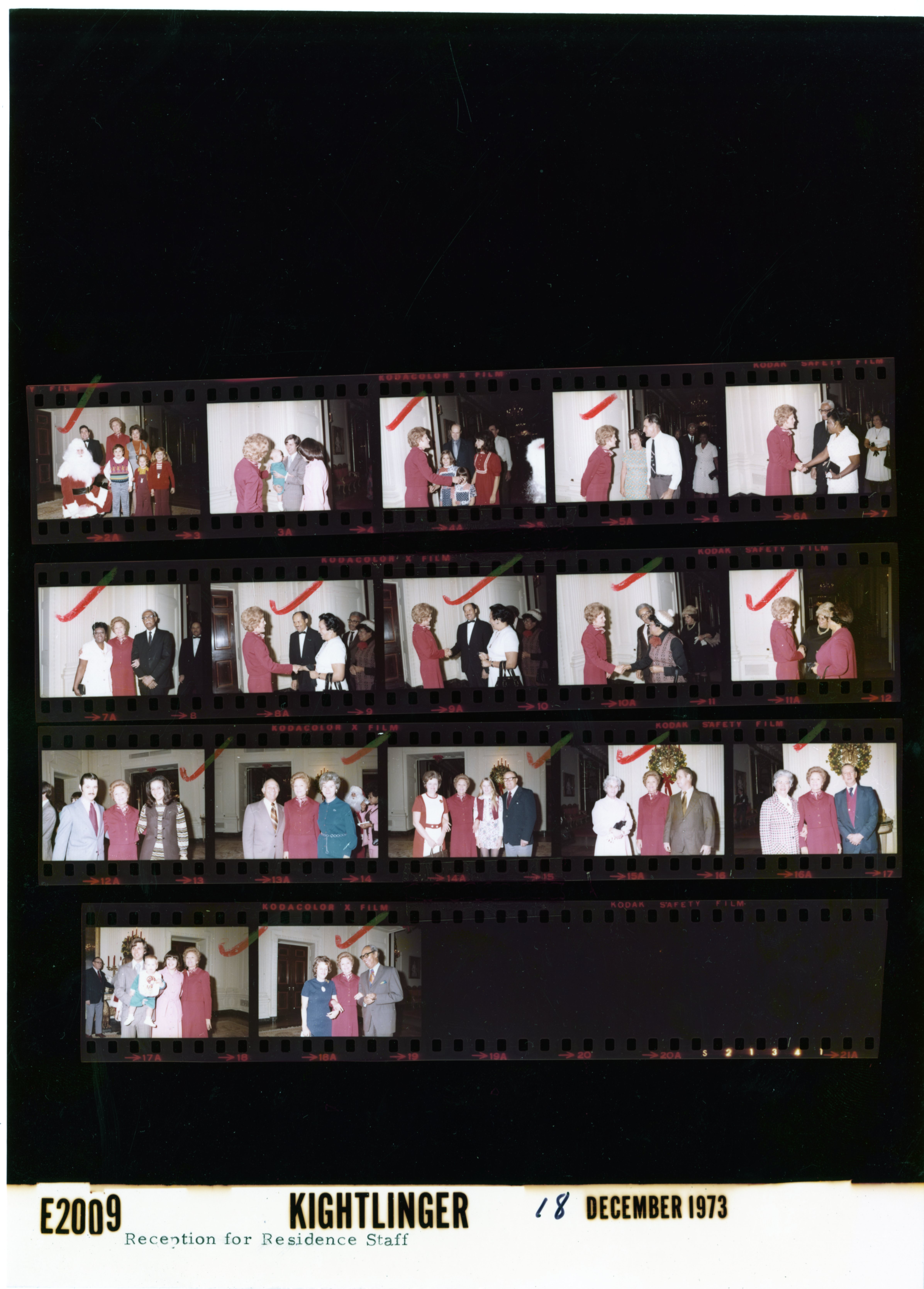 - Frame(s): WHPO-E2009-02A-07A, 10A-18A, Pat Nixon greeting guests as she hosts a Christmas holiday reception for the Nixon's White House residence staff. 12/18/1973, Washington, D.C. White House. Pat Nixon, White House Residence staff.