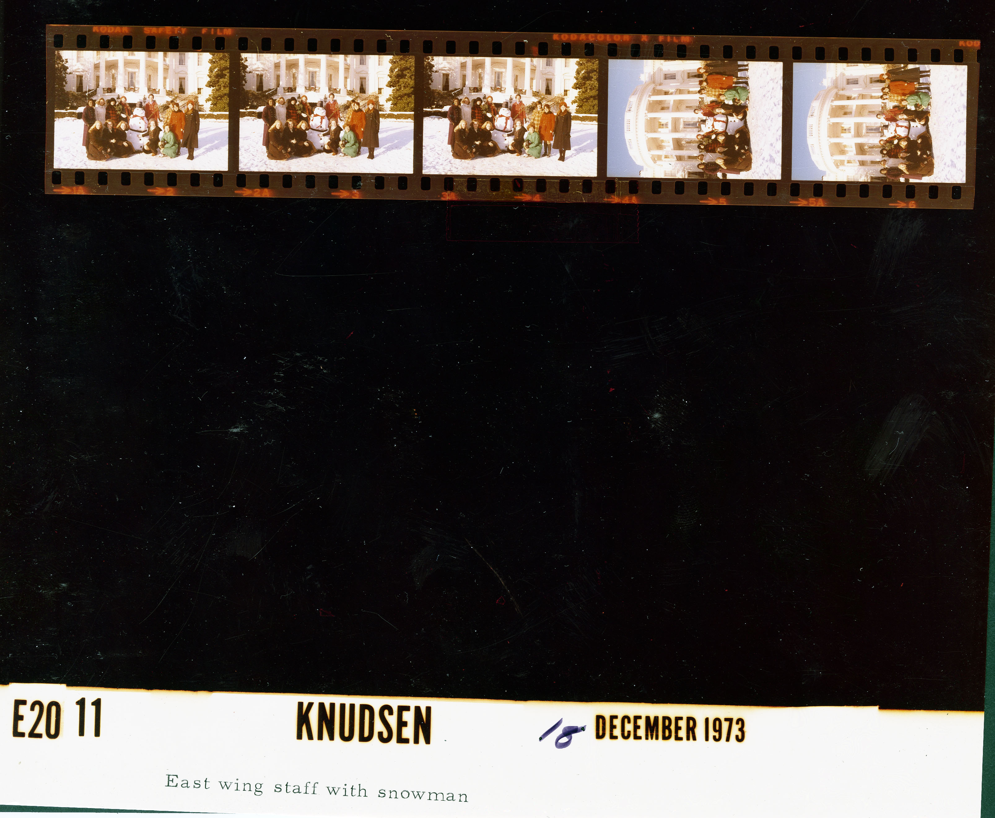 - Frame(s): WHPO-E2011-, East Wing staff members with a Christmas snowman in front of White House. 12/18/1973, Washington, D.C. White House, South Grounds. East Wing staff and snowman.