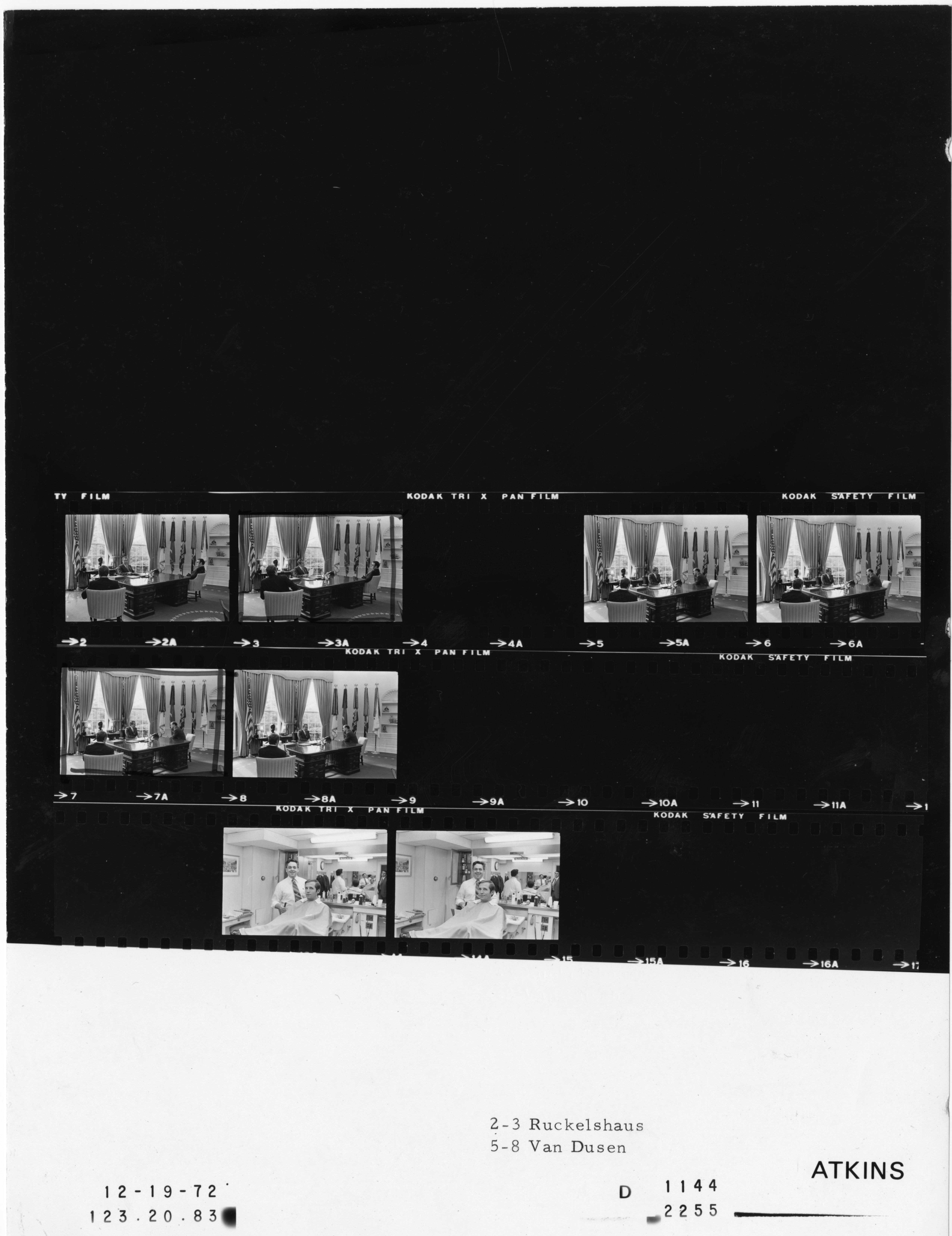 - Frame(s): WHPO-D1144-05A-08A, President Nixon seated at his desk with Ken Cole and Richard Van Dusen. 12/19/1972, Washington, D.C. White House, Oval Office. President Nixon, Kenneth Cole, William Ruckelshaus, Richard Van Dusen, barber, unidentified man.