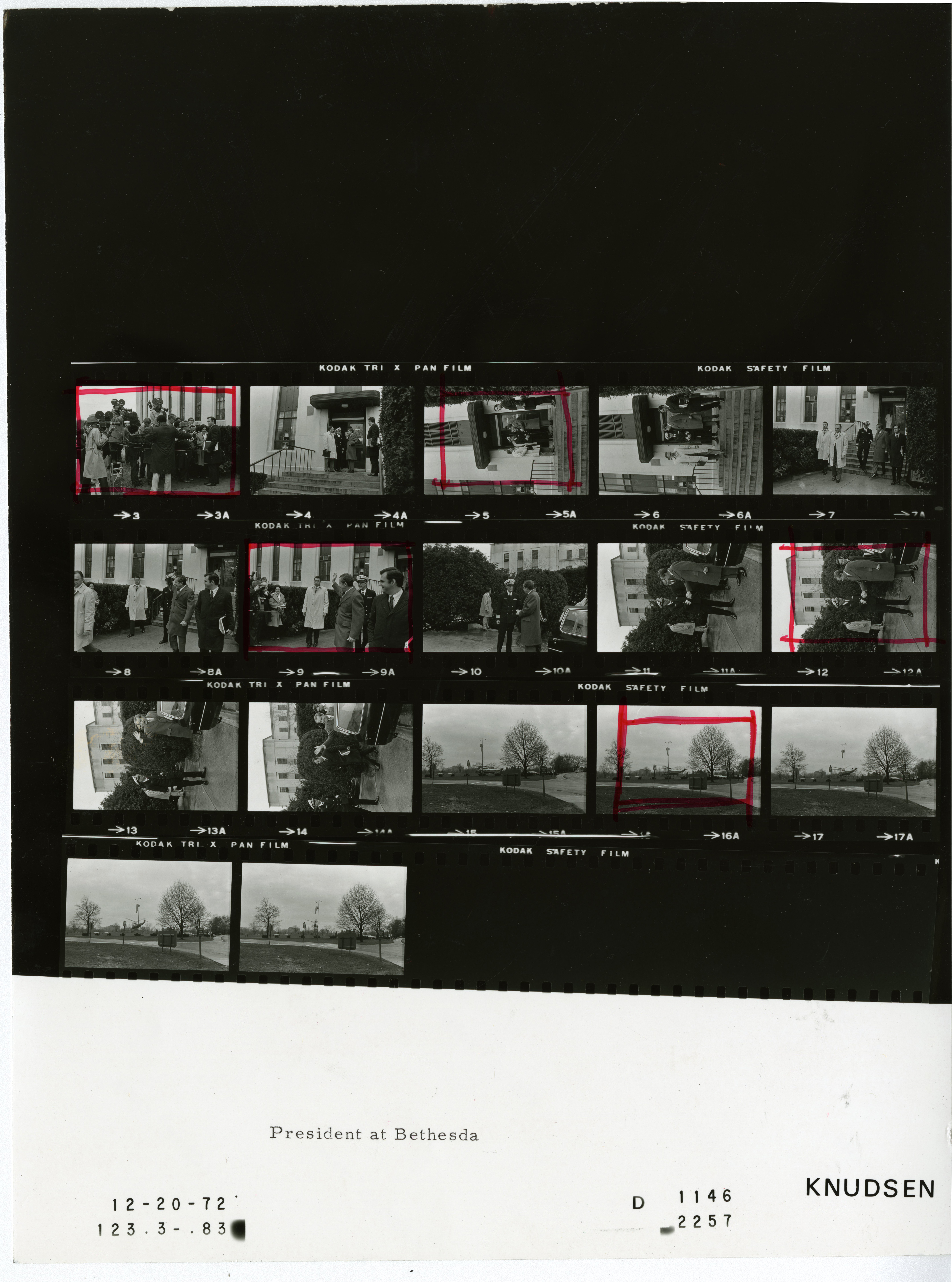 - Frame(s): WHPO-D1146-15-19, Marine One helicopter taking off from the heliport field at Bethesda Naval Hospital. 12/20/1972, Bethesda, Maryland helipad, Bethesda Naval Hospital. President Nixon, Maj. Gen. Dr. Walter R. Tkach, Rear Adm. Felix Ballenger, Ziegler, Helen Thomas, members of the press, aides.