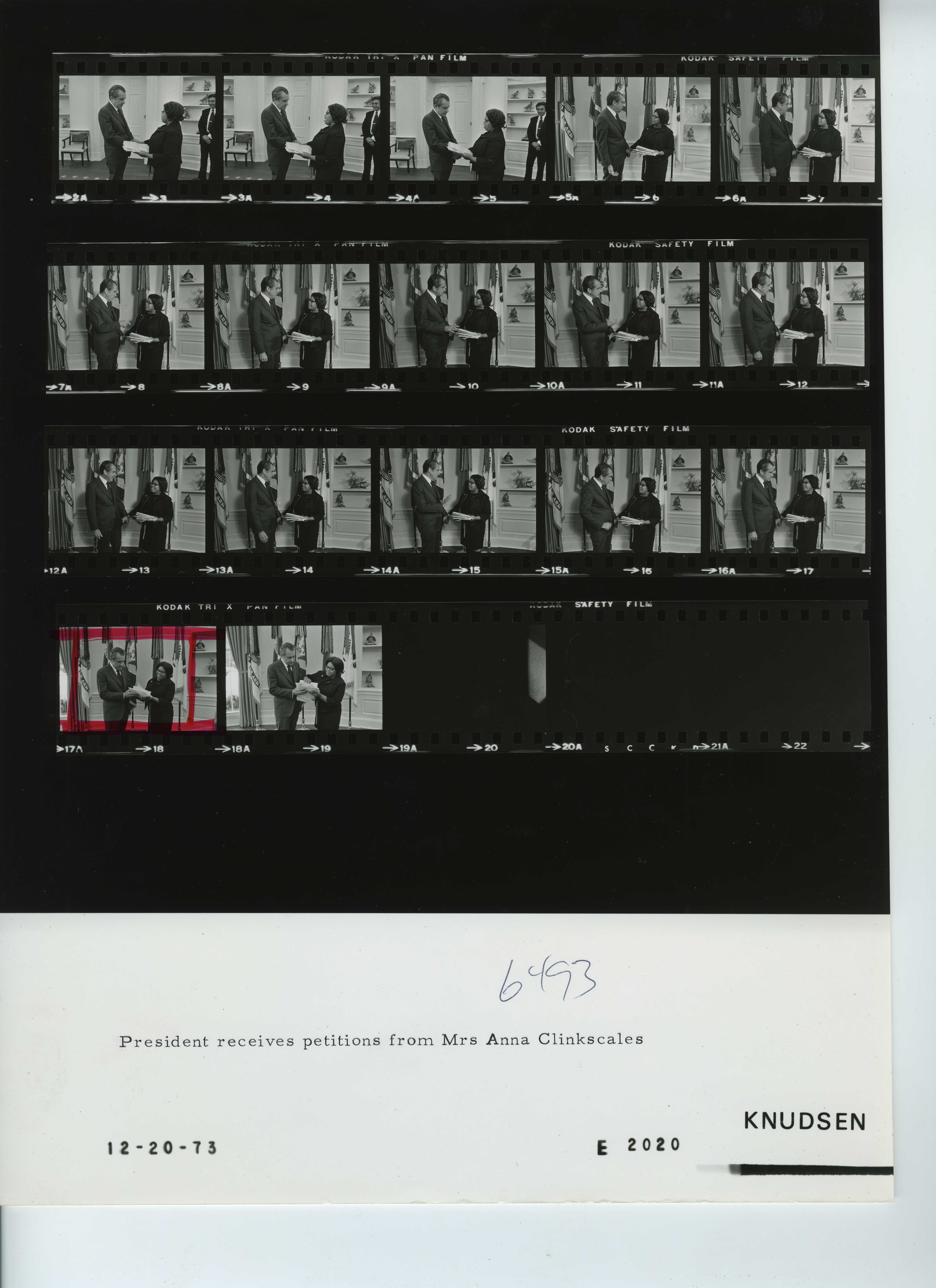 • Frame(s): WHPO-E2020-, President Nixon receives petitions from Mrs. Anna Clinkscales, organizer of a door-to-door campaign in Baltimore, Maryland, to demonstrate support for the President and President of the National Council of Negro Women for the State of Maryland. 12/20/1973, Washington, D.C. White House, Oval Office. President Nixon and Mrs. Anna Clinkscales.