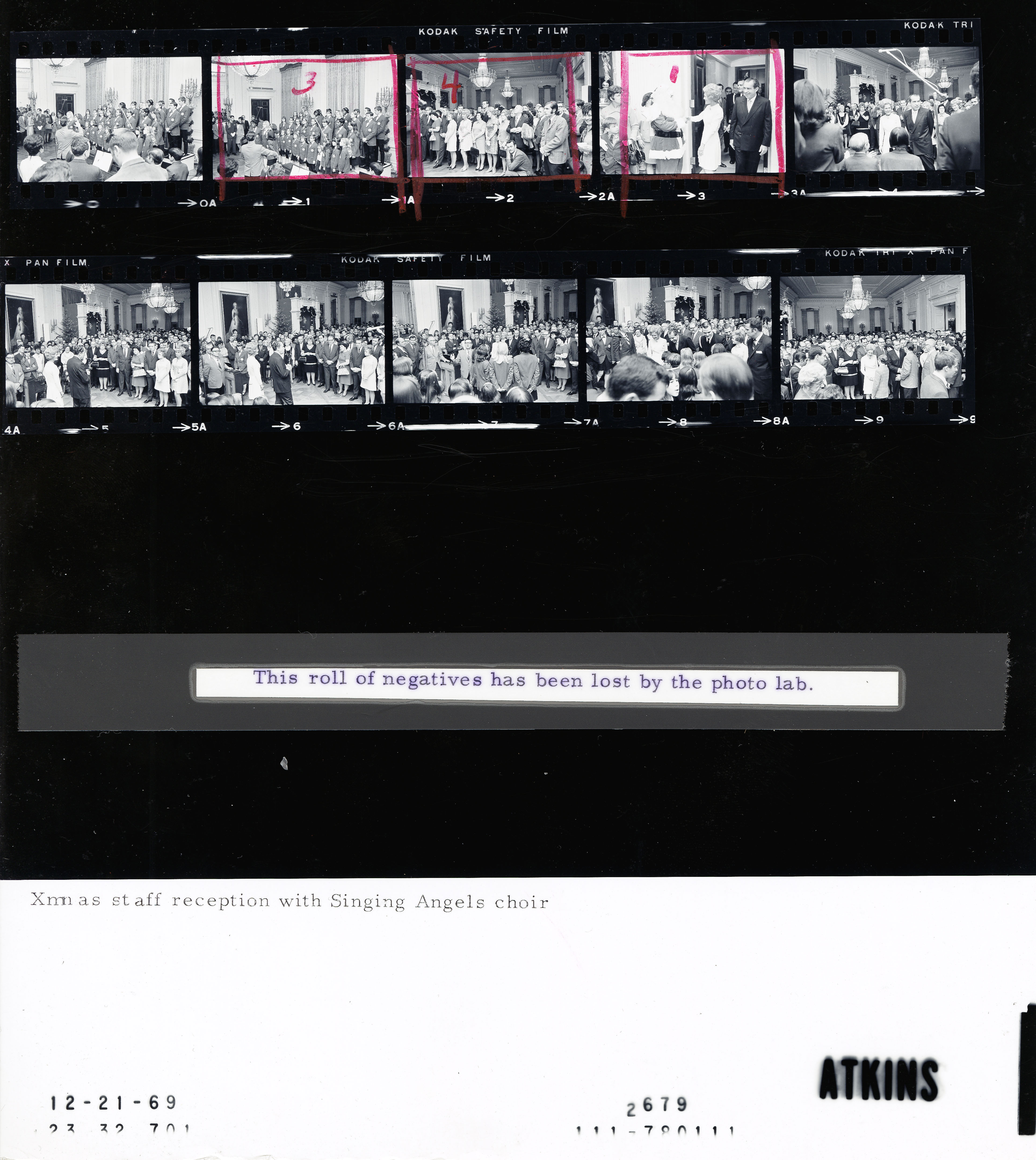 - Frame(s): WHPO-2679-08 No negative - contact sheet and print only., President Nixonn and Pat Nixon greeting guests at White House Staff Christmas Party. 12/21/1969, Washington, D.C. White House, East Room. President Nixon, Pat Nixon, Singing Angels, White House staff and guests, Santa Claus.