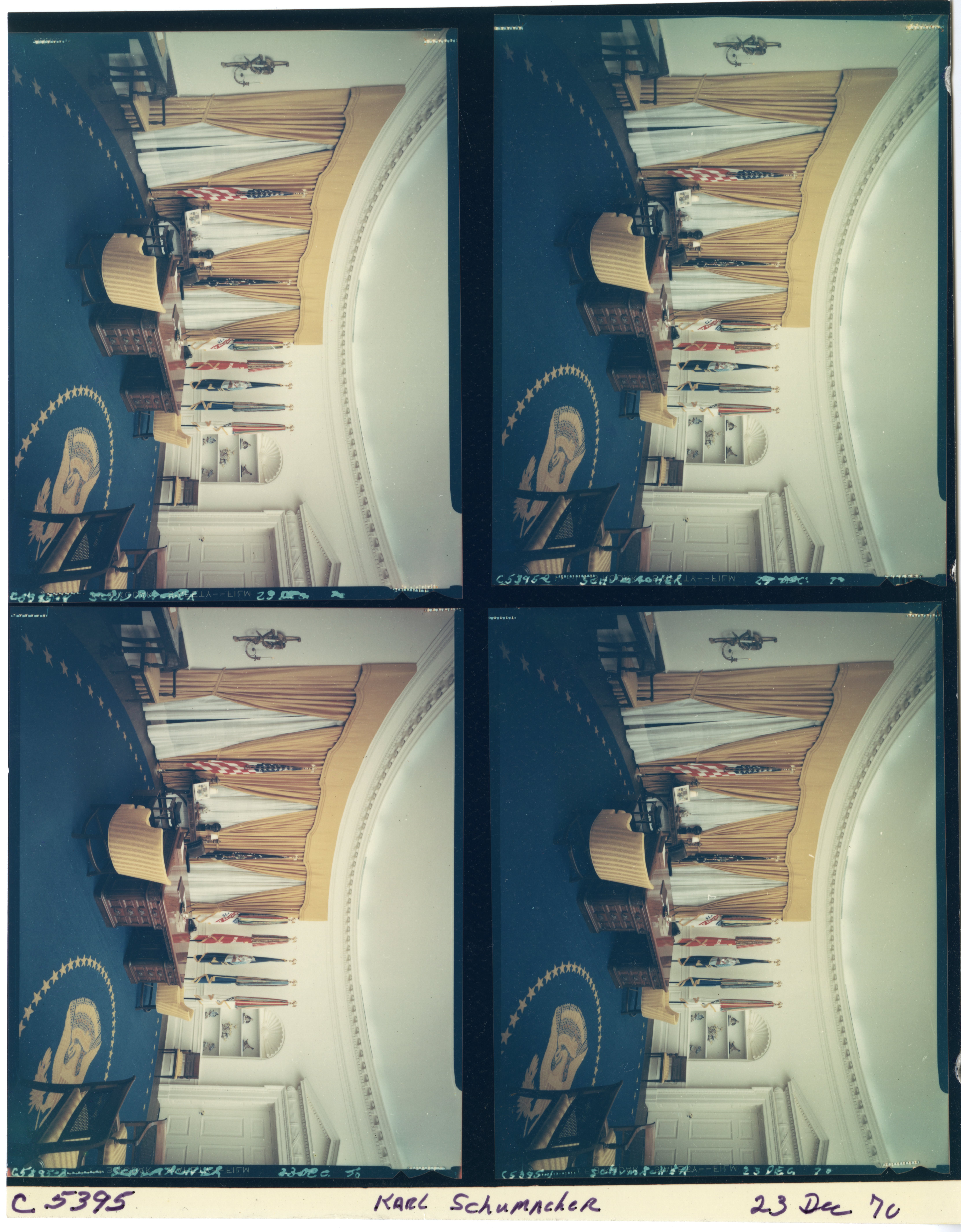 - Frame(s): WHPO-5395-01, Oval Office interior, desk, flags and Presidential Coat of Arms visible on carpet. 12/23/1970, Washington, D.C. White House, Oval Office.