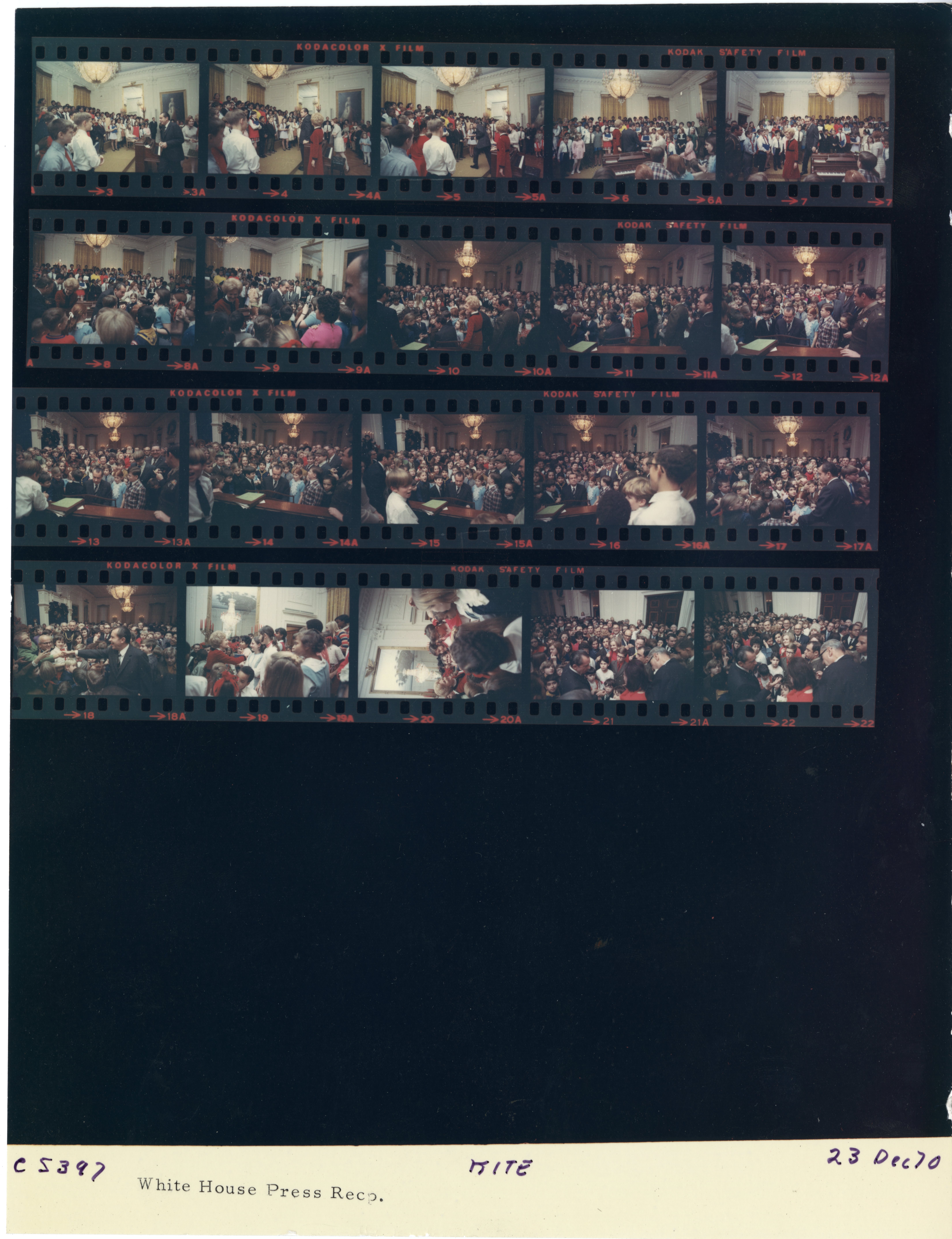 - Frame(s): WHPO-5397-18, President Nixon greeting guests in a crowd, at the Christmas Open House for the White House Press Corps and their families in the East Room. Children of the press corps families are gathered around him. 12/23/1970, Washington, D.C. White House, East Room. President Nixon, Pat Nixon, unidentified guests, reporters, editors, photographers, and their children.