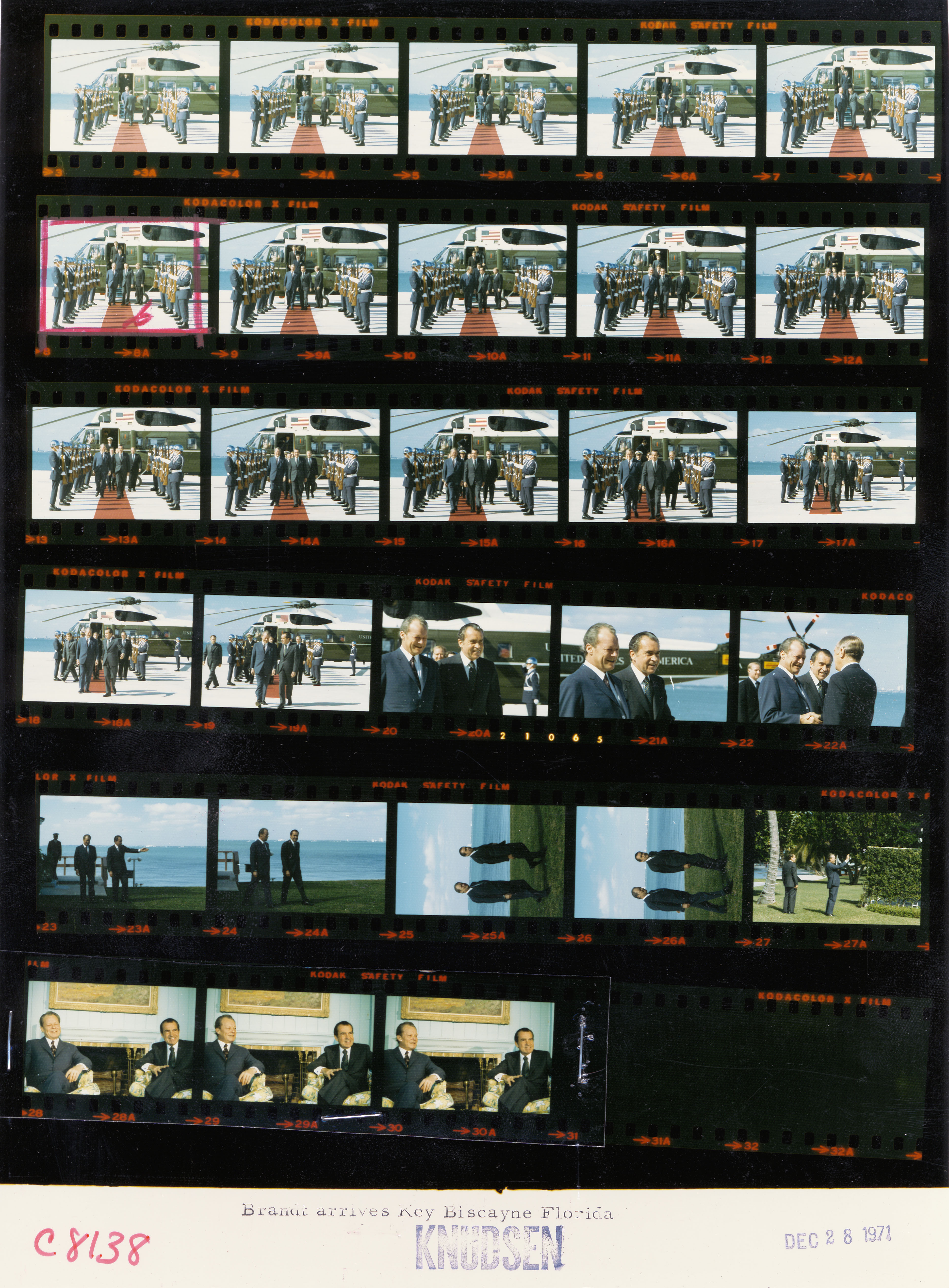 - Frame(s): WHPO-8140-, President Nixon meets with West German Chancellor Willy Brandt in Key Biscayne. 12/28/1971, Florida Key Biscayne home & heliport. President Nixon, Willy Brandt, unidentified aides, honor guard.