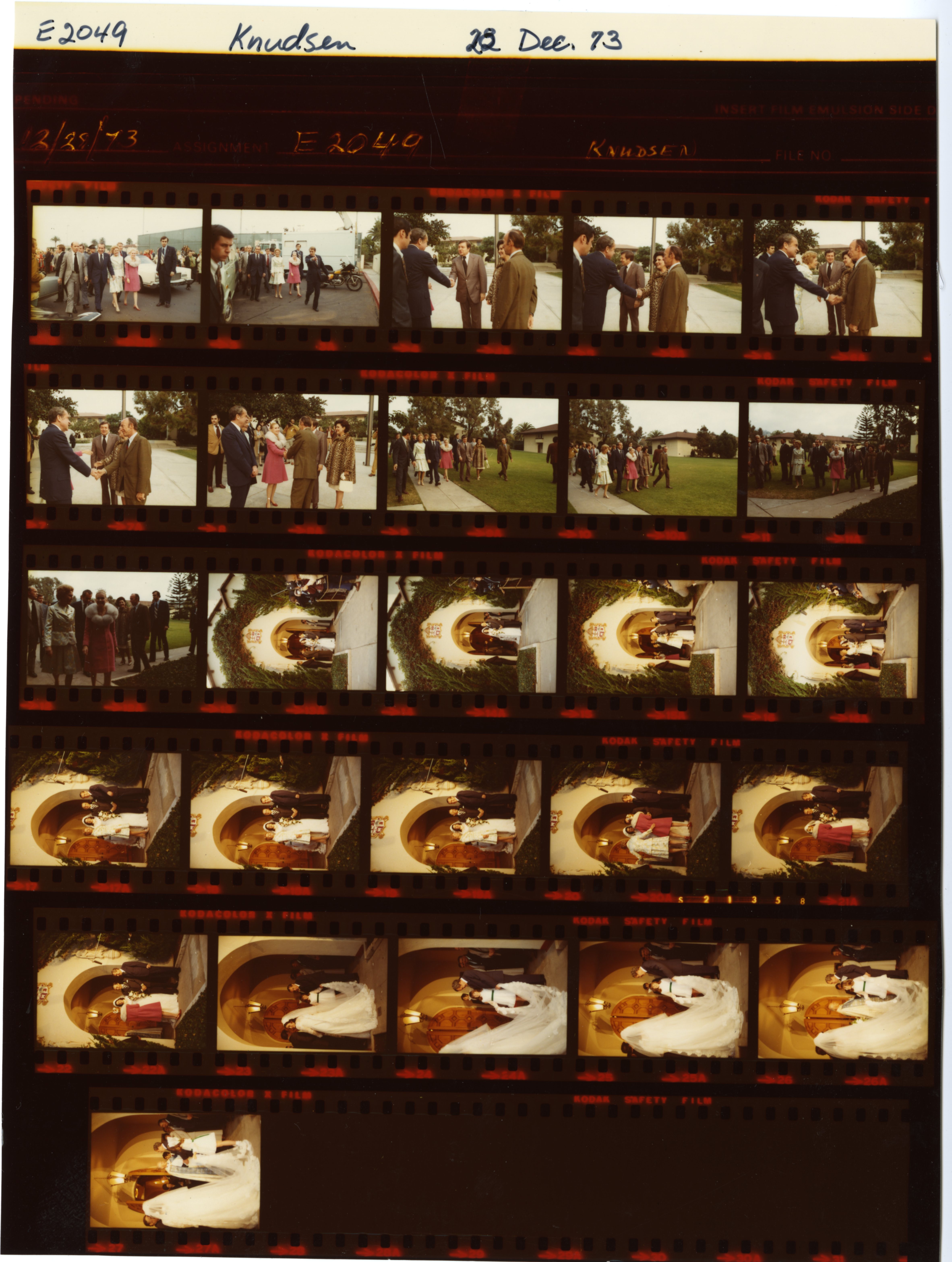 - Frame(s): WHPO-E2049-04A-05A, President Nixon greeting members of the bridal couples family after arriving to attend the wedding of Major General Dr. Walter R. Tkach, the President's Physician, to Cheryle Ann Gaillard. 12/28/1973, La Jolla, California Bishop's School Chapel. President Nixon, Pat Nixon, Tricia Cox, Maj. Gen. Dr. Walter R. Tkach, Mrs. Tkach, officiating minister Rev. Robert M. Wolterstorff, Leon Parma, Pres. Of the Board of Trustees of the Bishop's School, Mrs. Parma, and Philip Perkins, Bishop's School headmaster.