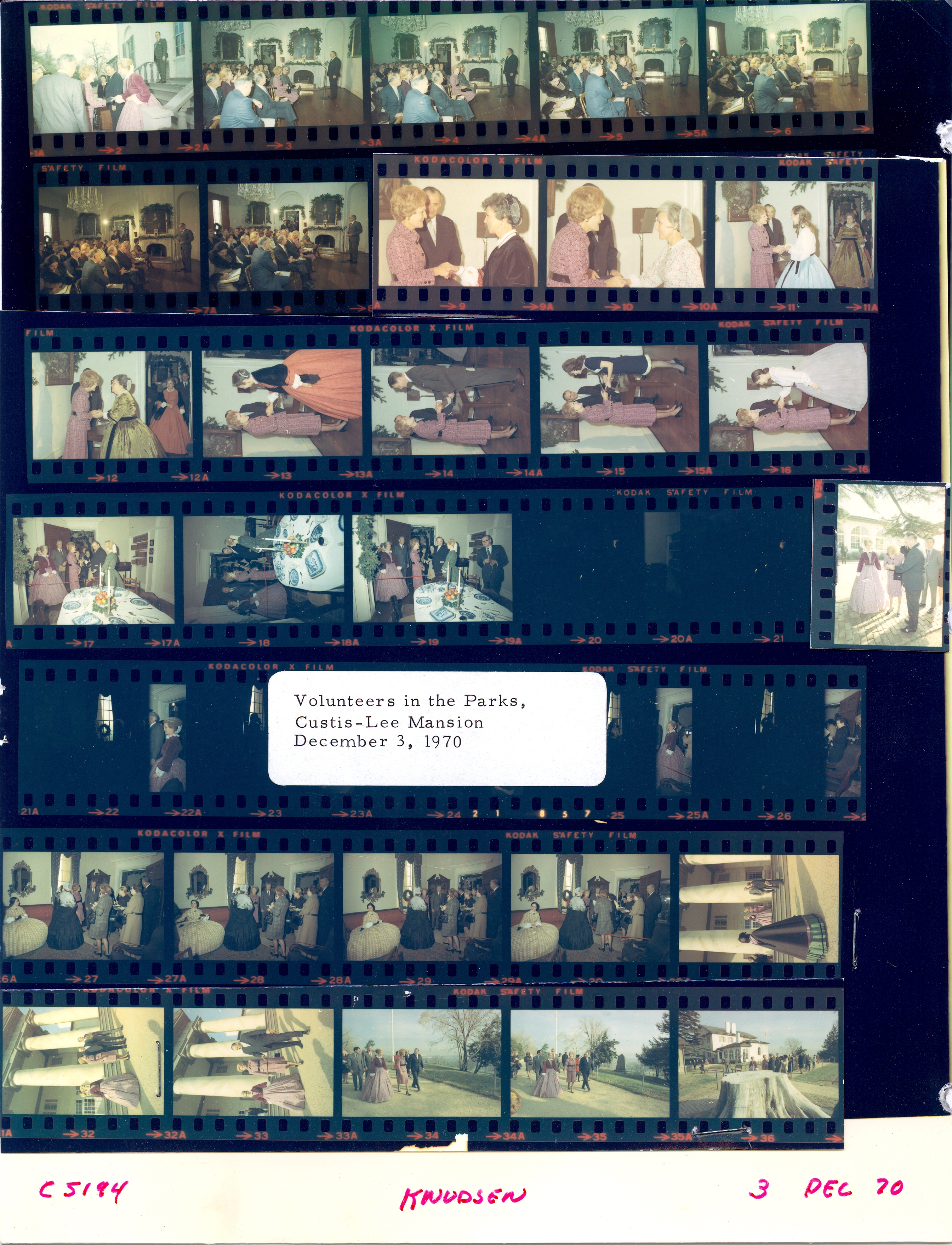 - Frame(s): WHPO-5194-01A-35A, Volunteer Docents in the Custis Lee Mansion Park dressed in period costumes, also known as Arlington House, the Robert E. Lee Memorial. 12/3/1970, Arlington, Virginia Custis-Lee Mansion (Arlington House, the Robert E. Lee Memorial). Pat Nixon, unidentified volunteer docents.