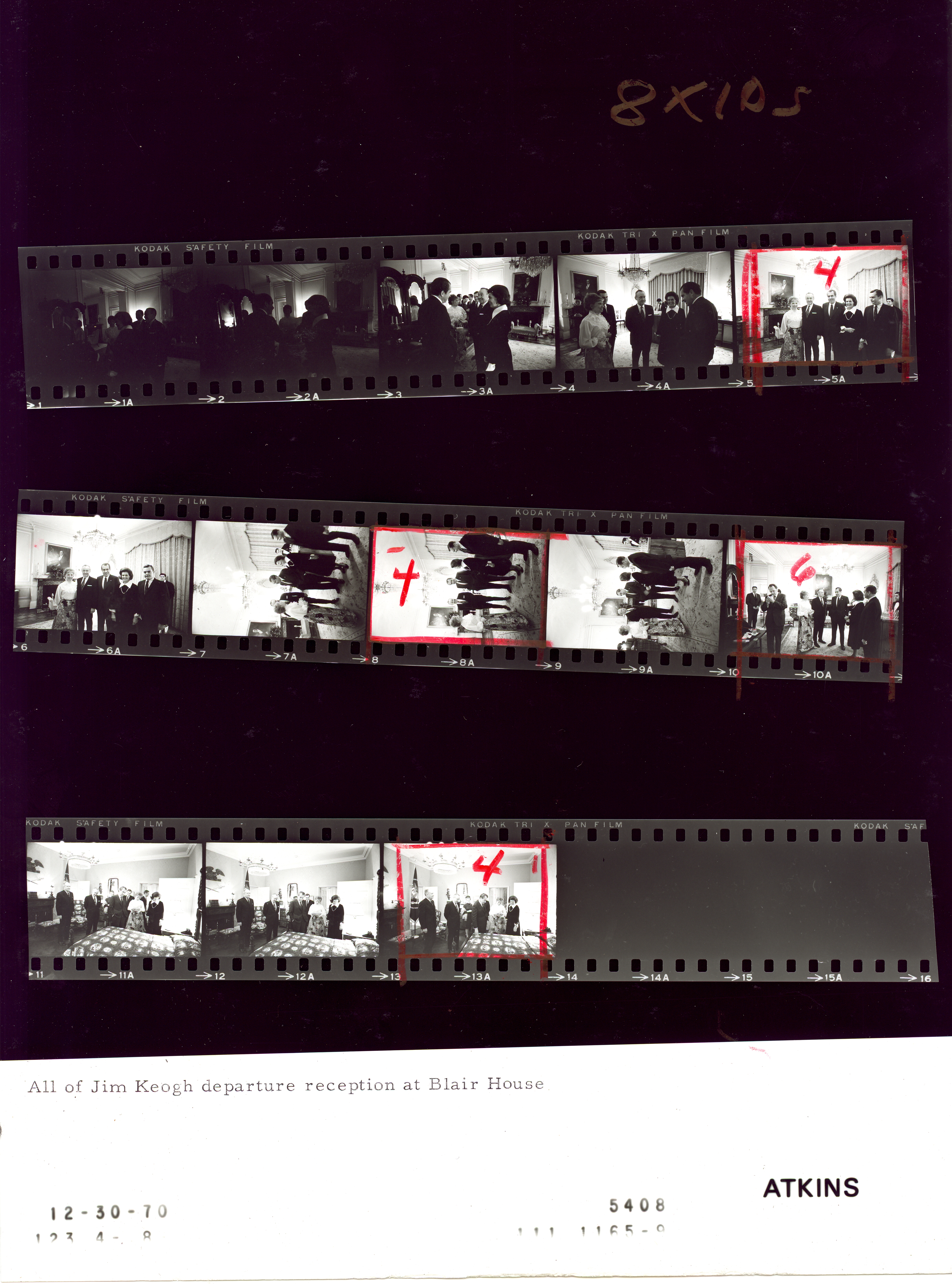 - Frame(s): WHPO-5408-01-13, President Nixon attending Jim Keogh's departure reception at Blair House. 12/30/1970, Washington, D.C. Blair House. President Nixon, James Keogh, unidentified guests.