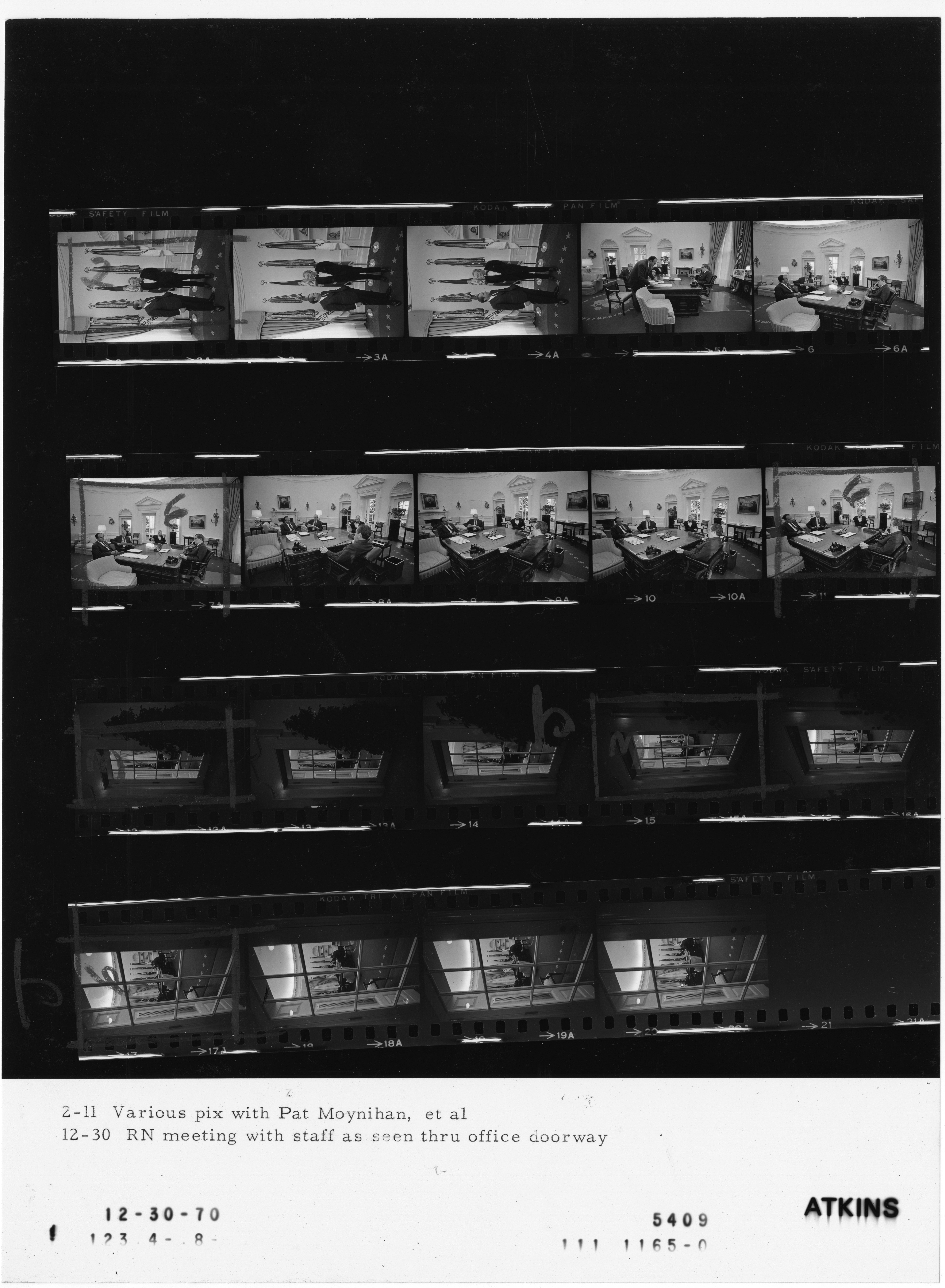 - Frame(s): WHPO-5409-12-21, President Nixon seated at his Oval Office desk during a meeting with Daniel Patrick Moynihan, John Ehrlichman and George Shultz, Director of the OMB.Viewed from the outside of an Oval Office Window looking in. 12/30/1970, Washington, D.C. White House, Oval Office. President Nixon, Patrick Moynihan, John Ehrlichman, George Shultz.