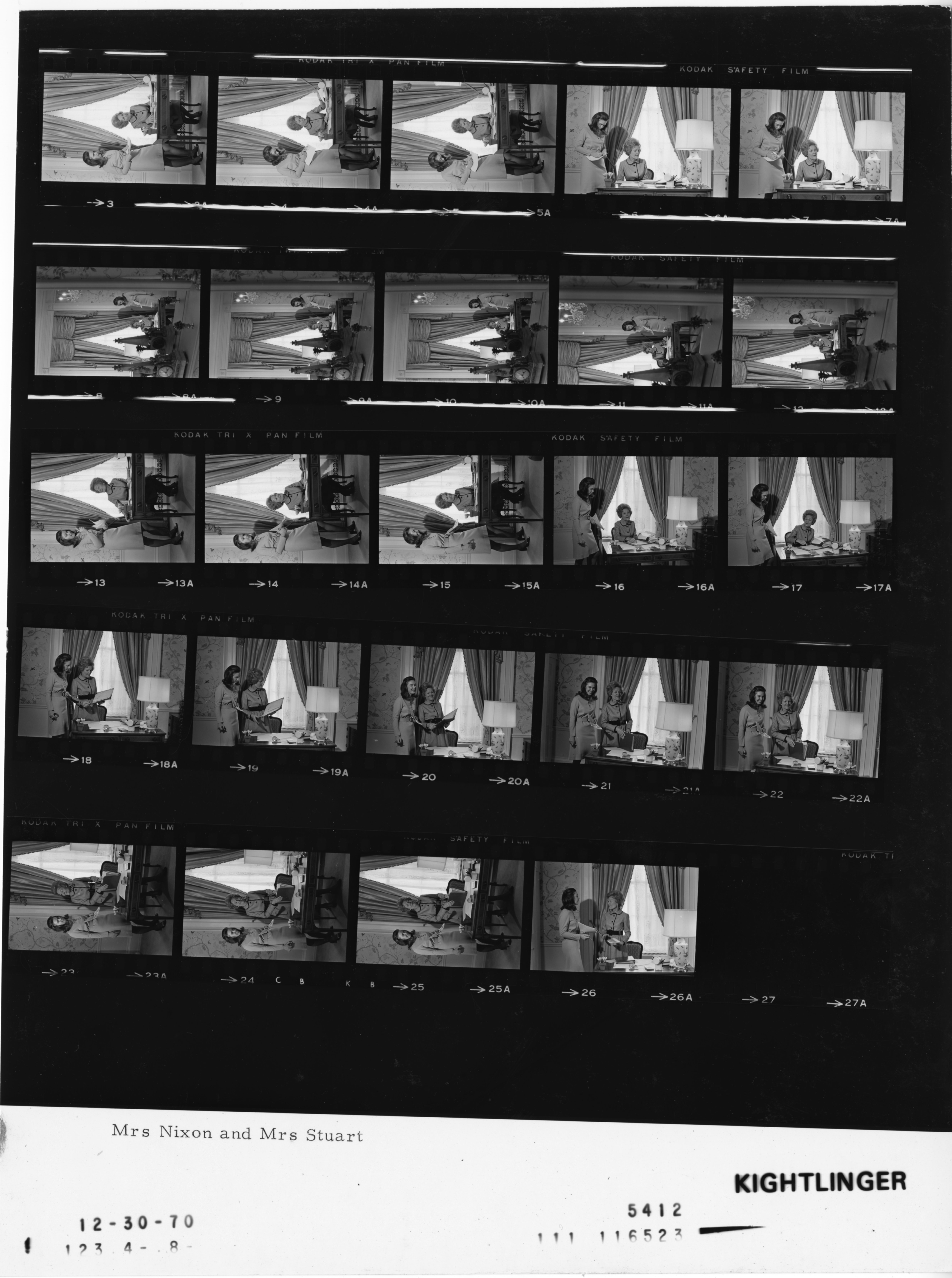 - Frame(s): WHPO-5412-03-26, Pat Nixon working at her desk during a meeting with her personal Staff Director and Press Secretary Connie Stuart. 12/30/1970, Washington, D.C. White House, Office of the First Lady. Pat Nixon, Constance Cornell Stuart.