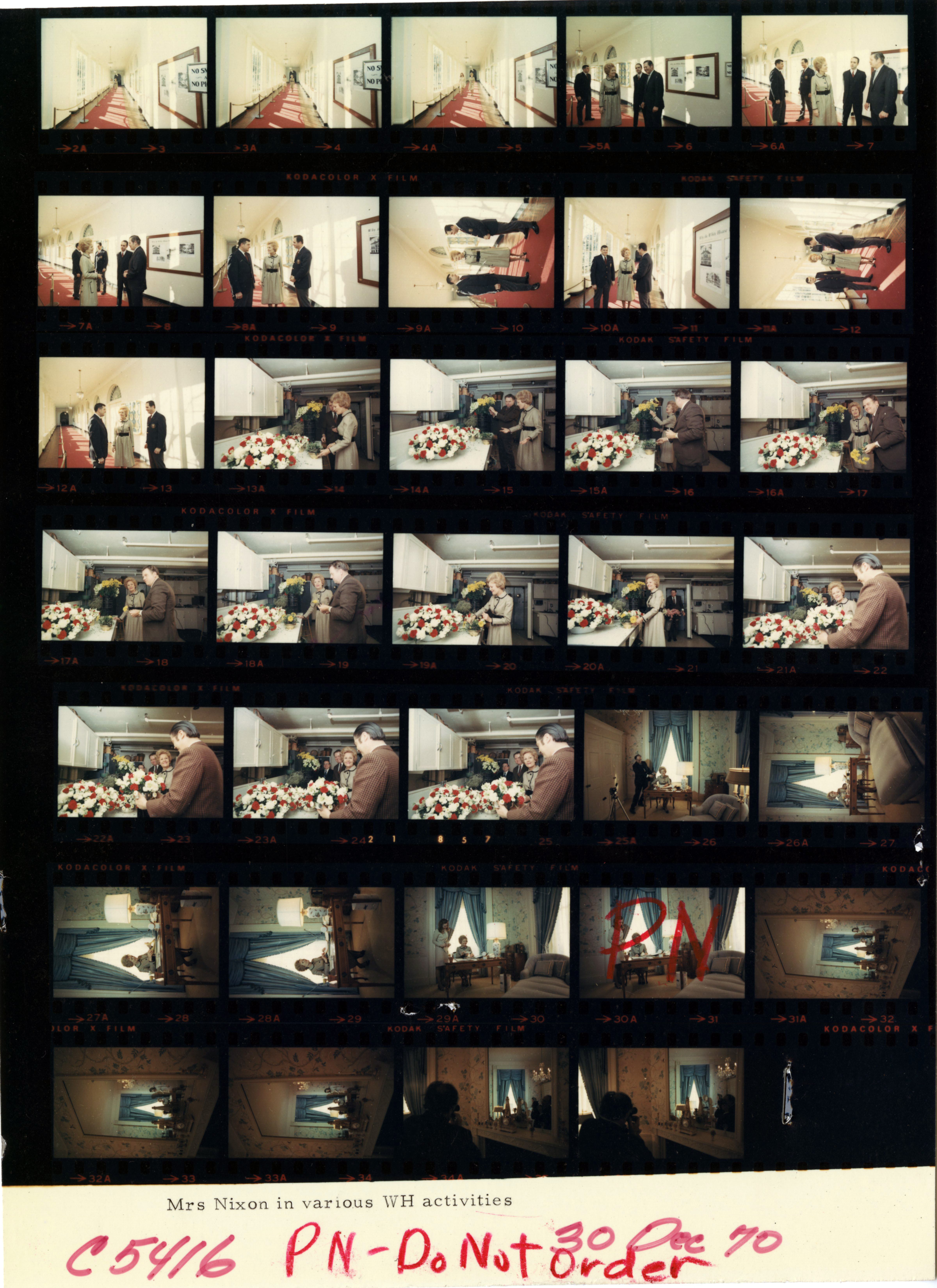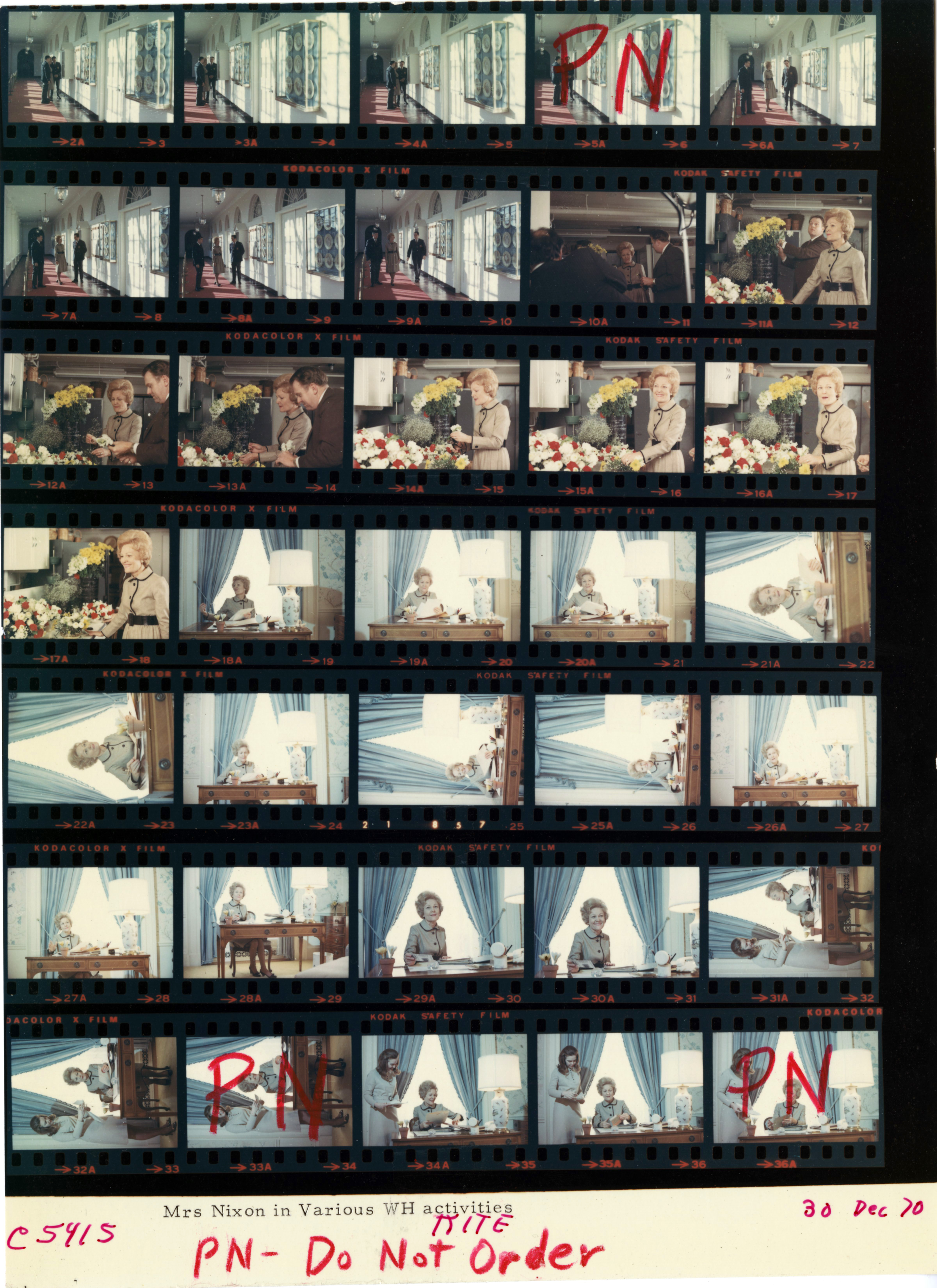 - Frame(s): WHPO-5416-25A-35A, Pat Nixon sitting at her office desk. 12/30/1970, Washington, D.C. White House, Office of the First Lady. Pat Nixon, Constance Cornell Stuart, unidentified White House staff.