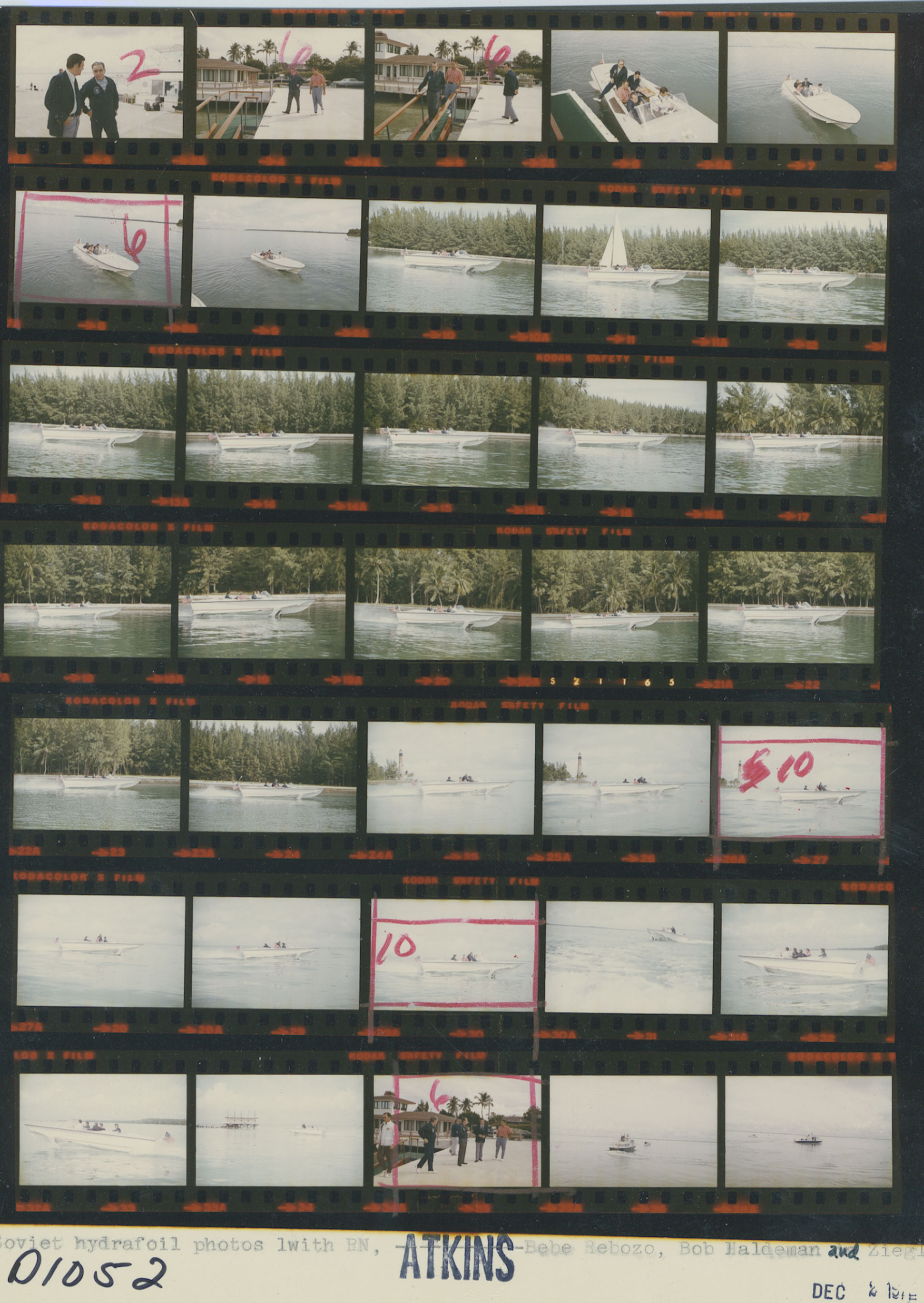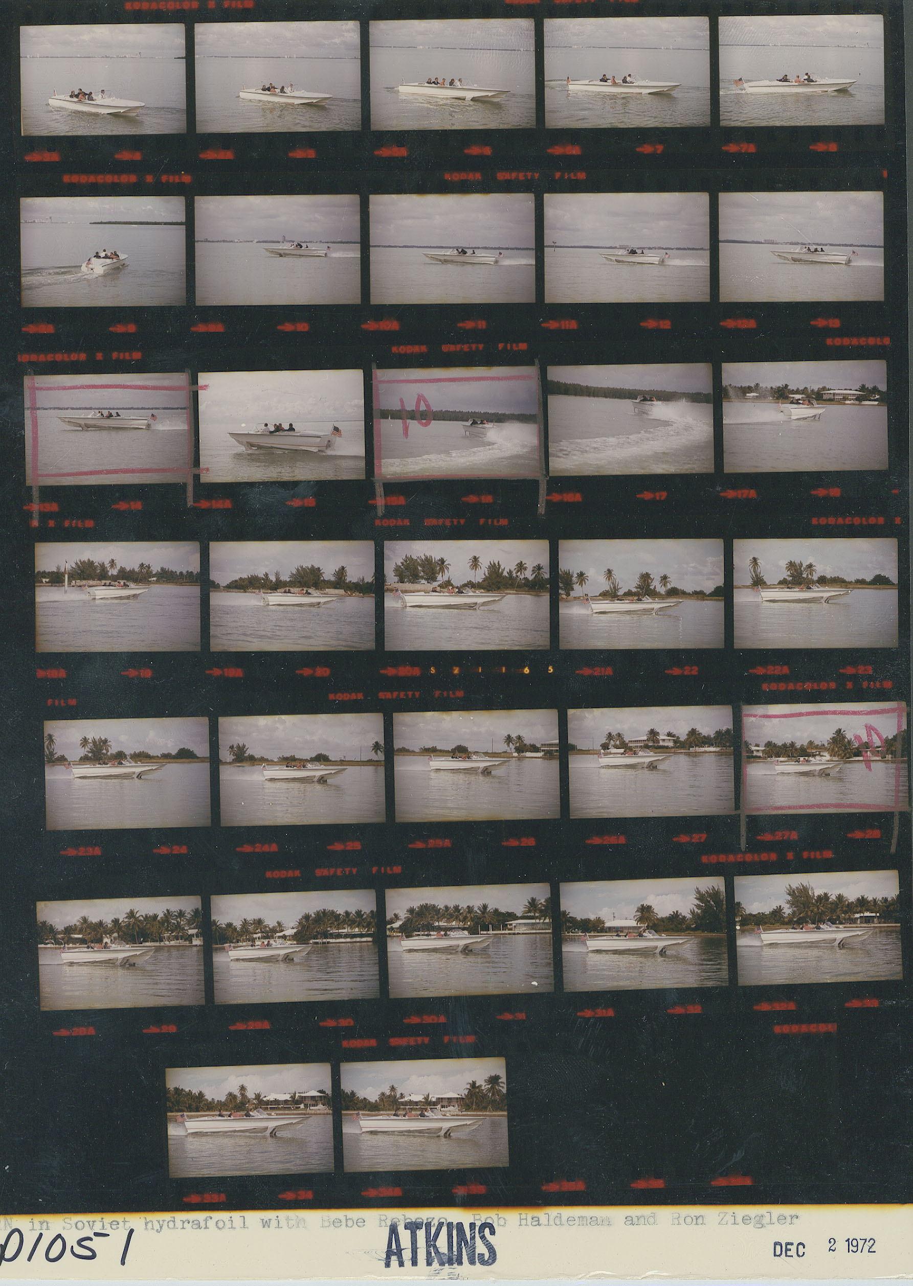 - Frame(s): WHPO-D1051-, President Nixon and others on a hydrofoil. 12/4/1972, Key Biscayne, Florida hydrofoil, Biscayne Bay. President Nixon, Haldeman, Bebe Rebozo, Ziegler, boat captain.