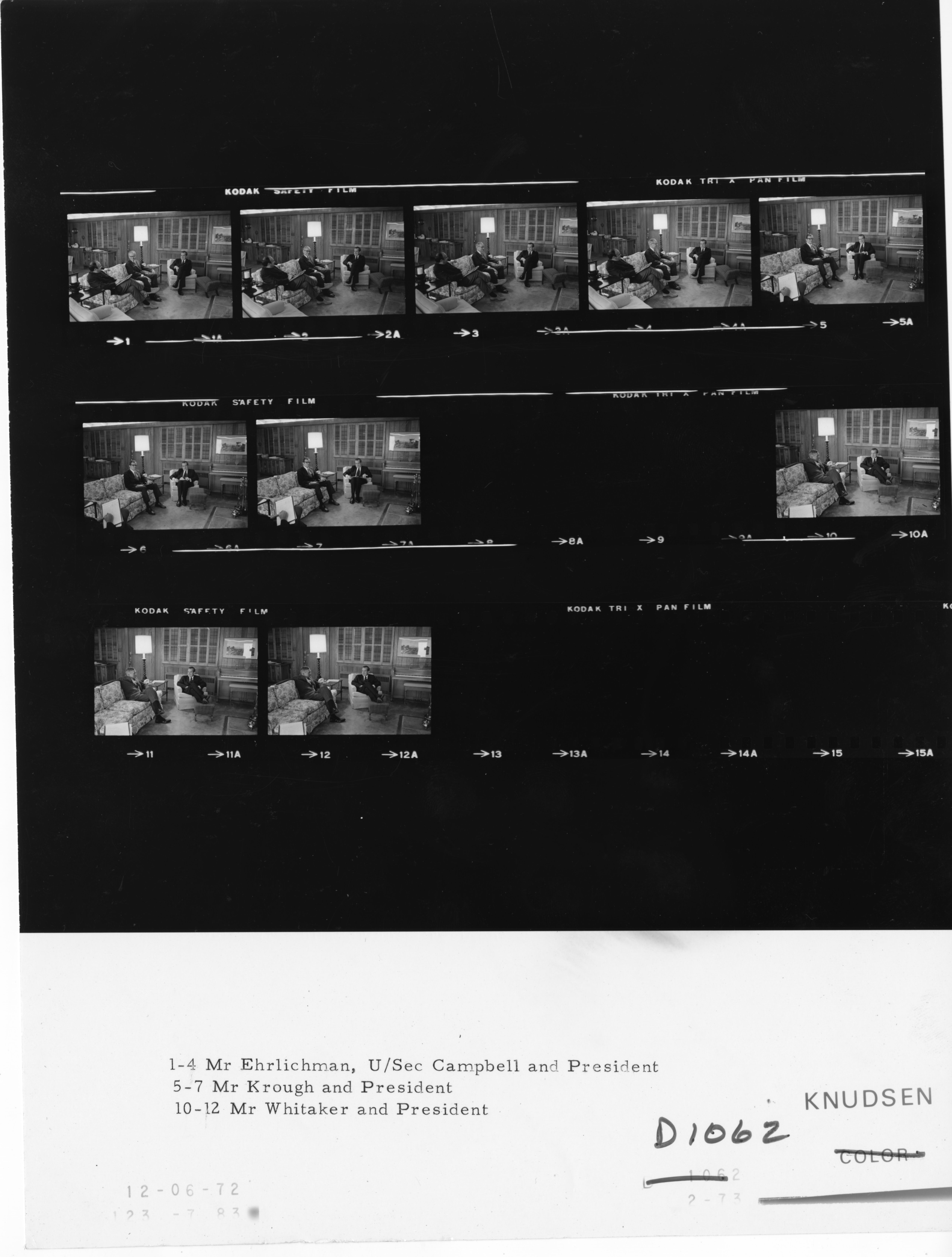 - Frame(s): WHPO-D1062-10-12, President Nixon seated informally with John Whitaker. 12/6/1972, Camp David, Maryland Aspen Lodge, den. President Nixon, John Whitaker.