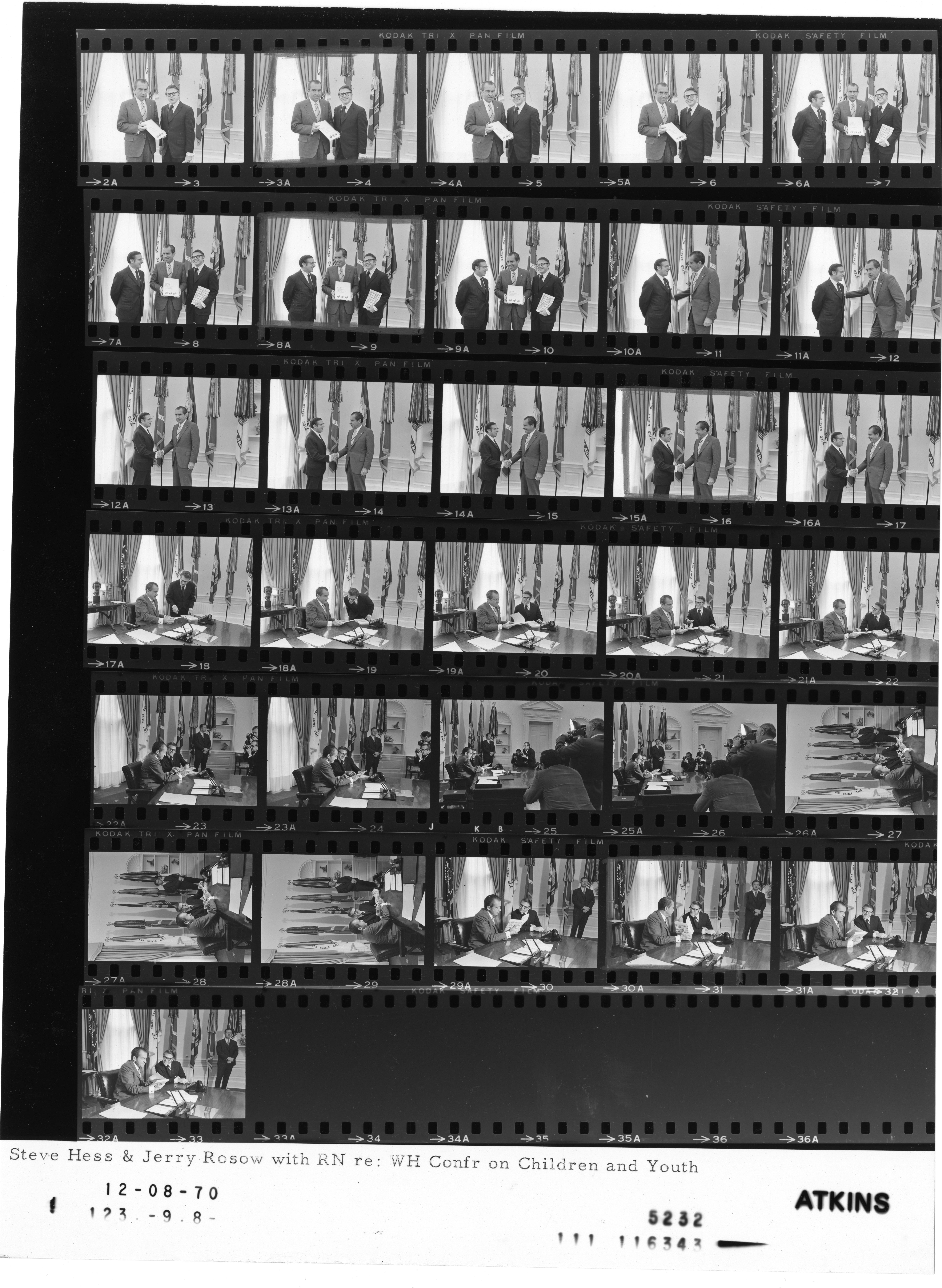 - Frame(s): WHPO-5232-02A-32A, President Nixon meeting with Steve Hess and Jerry Rosow regarding the Conference on Children and Youth. 12/8/1970, Washington, D.C. White House, Oval Office. President Nixon, Steve Hess, Jerry Rosow.
