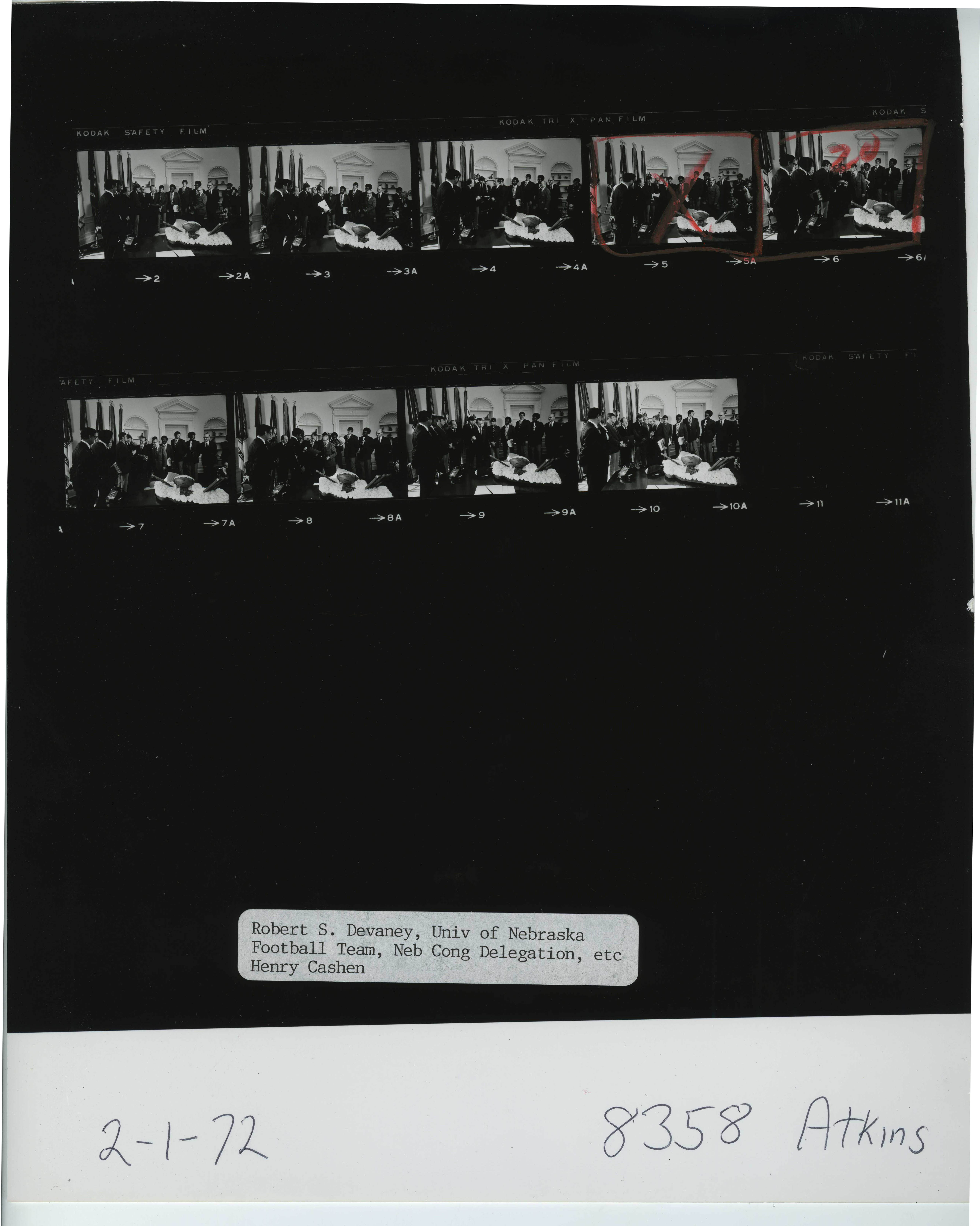 - Frame(s): WHPO-8358-, President Nixon standing with the coach and members of the University of Nebraska football team and members of the Nebraska Congressional delegation. 2/1/1972, Washington, D.C. White House, Oval Office. President Nixon, Bob Devaney, Jerry Tagge, Jim Anderson, Carl Curtis, Representatives, team members.