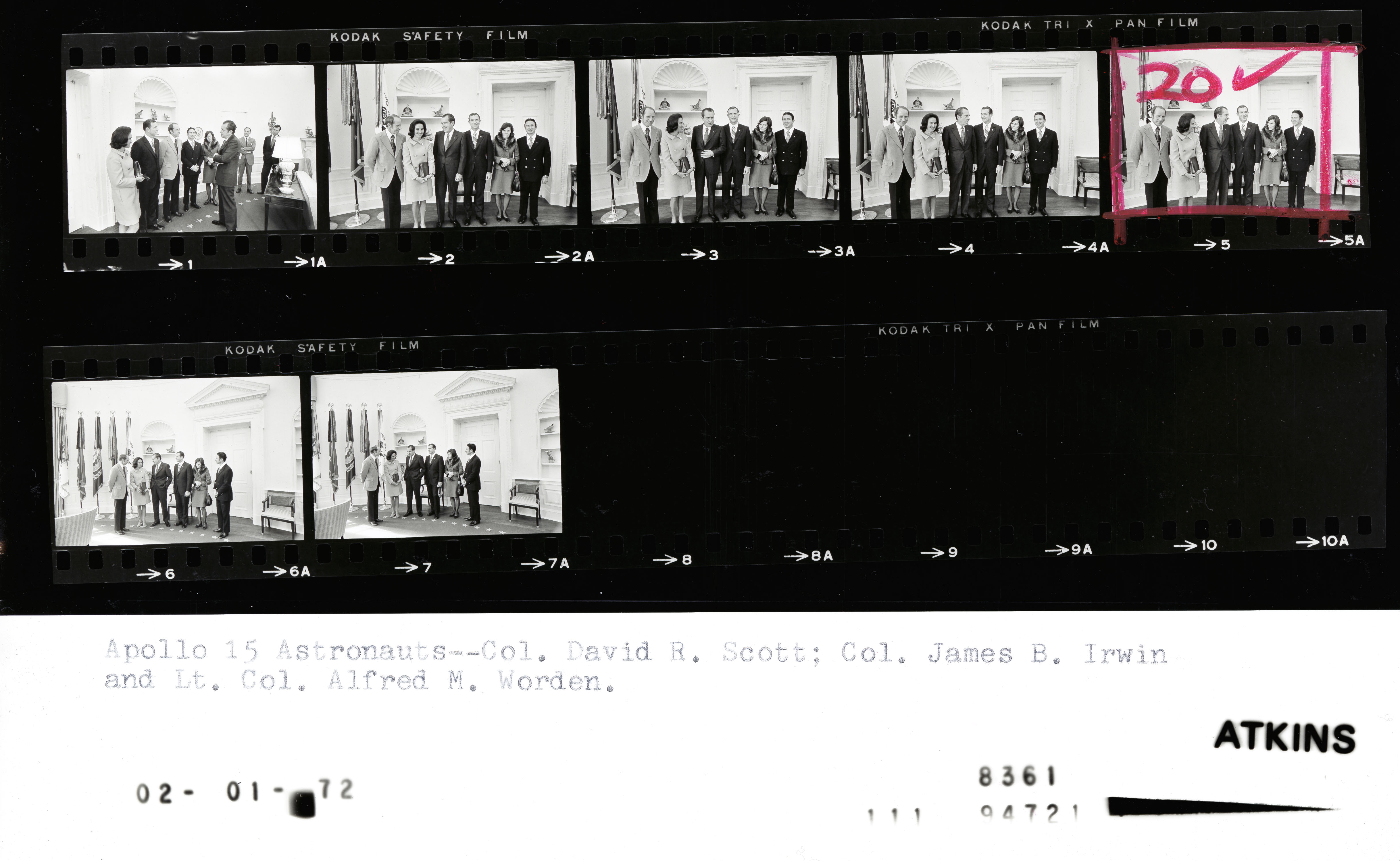 - Frame(s): WHPO-8361-, President Nixon standing with Apollo XV (Apollo 15) astronauts Col. David Scott, Lt. Col. Alfred Worden, Col. James Irwin, and their wives. 2/1/1972, Washington, D.C. White House, Oval Office. President Nixon, David Scott, Mrs. David Scott, Alfred Worden, James Irwin, Mrs. James Irwin, Haig, Peter Flanigan.