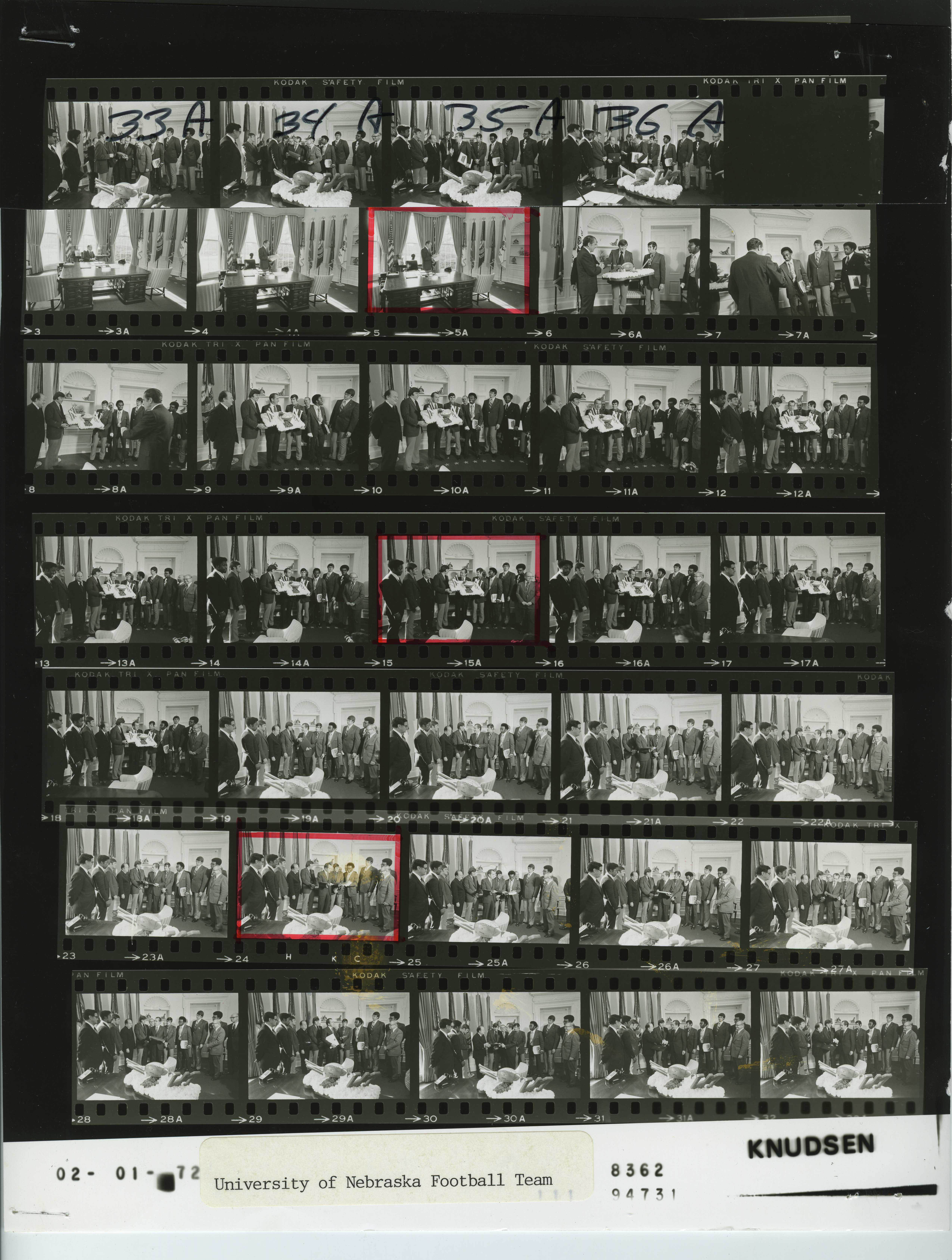 - Frame(s): WHPO-8362-01A-02A, President Nixon with the Univ. of Nebraska football team members and coaches in the Cabinet Room. 2/1/1972, Washington, D.C. White House, Cabinet Room. President Nixon, Nebraska football team members and coaches.