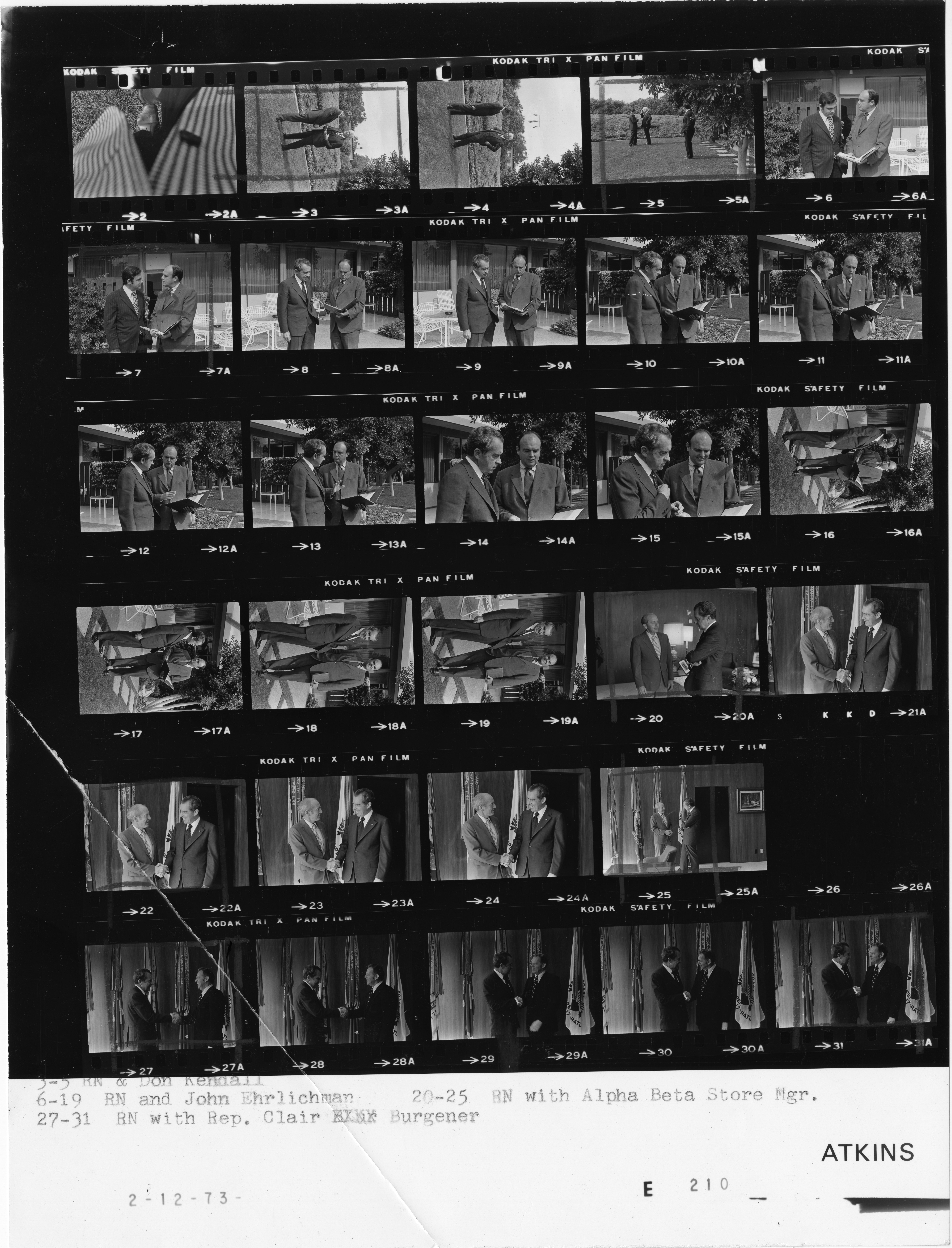 - Frame(s): WHPO-E0210-03-05, President Nixon standing with Donald Kendall. 2/12/1973, San Clemente, California lawn, patio, inside of Presidential Office. President Nixon, Donald Kendall, Ziegler, Ehrlichman, Leon Reilly, Clair Burgener.