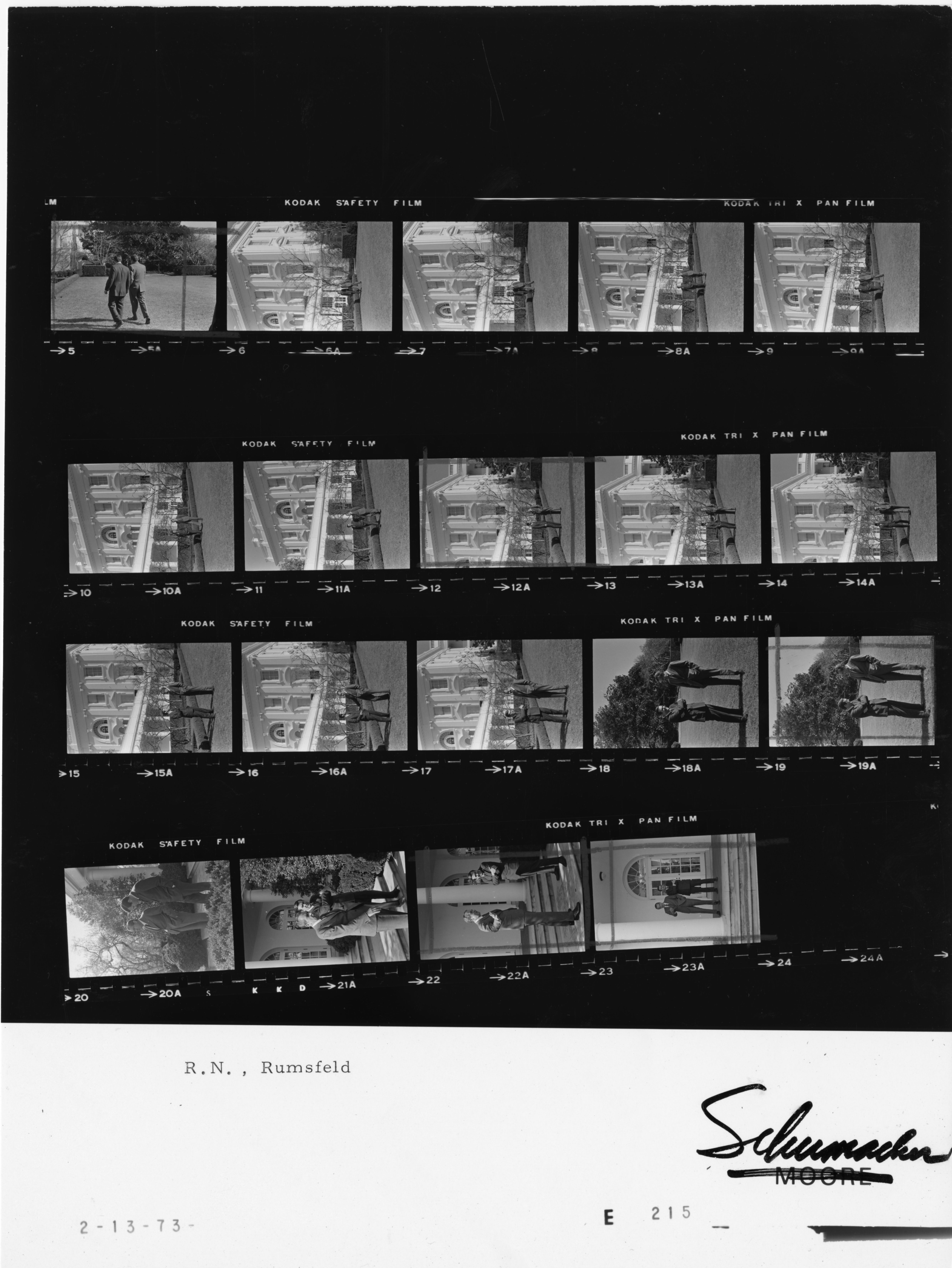 - Frame(s): WHPO-E0215-, President Nixon standing and speaking with Donald Rumsfeld in the rose garden area outside the White House. 2/13/1973, Washington, D.C. Rose Garden, White House. President Nixon, Donald Rumsfeld.