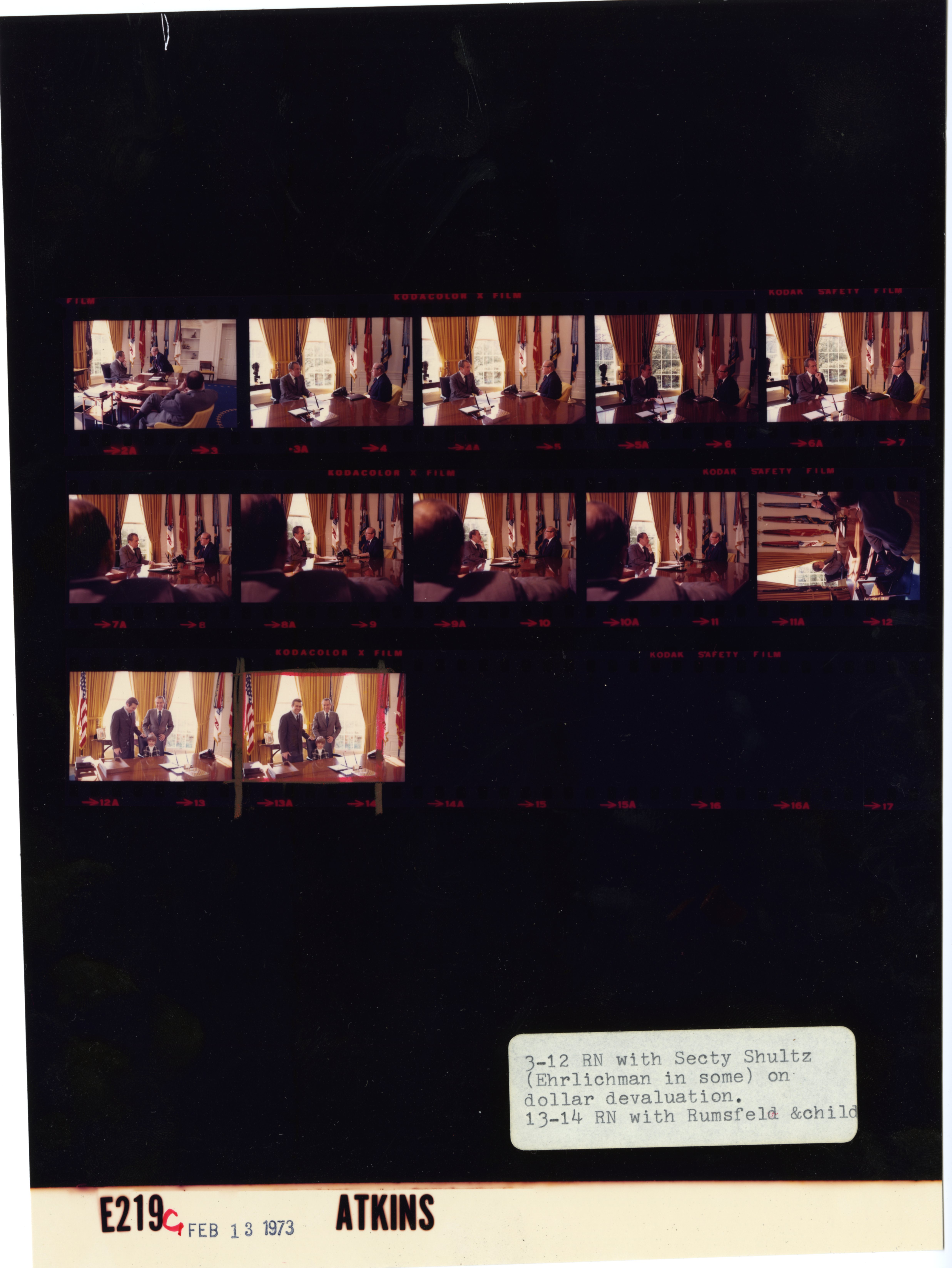 - Frame(s): WHPO-E0219-13-14, President Nixon standing at his desk next to Donald Rumsfeld and his young son. 2/13/1973, Washington, D.C. White House, Oval Office. President Nixon, Rumsfeld, Nicholas Rumsfeld.