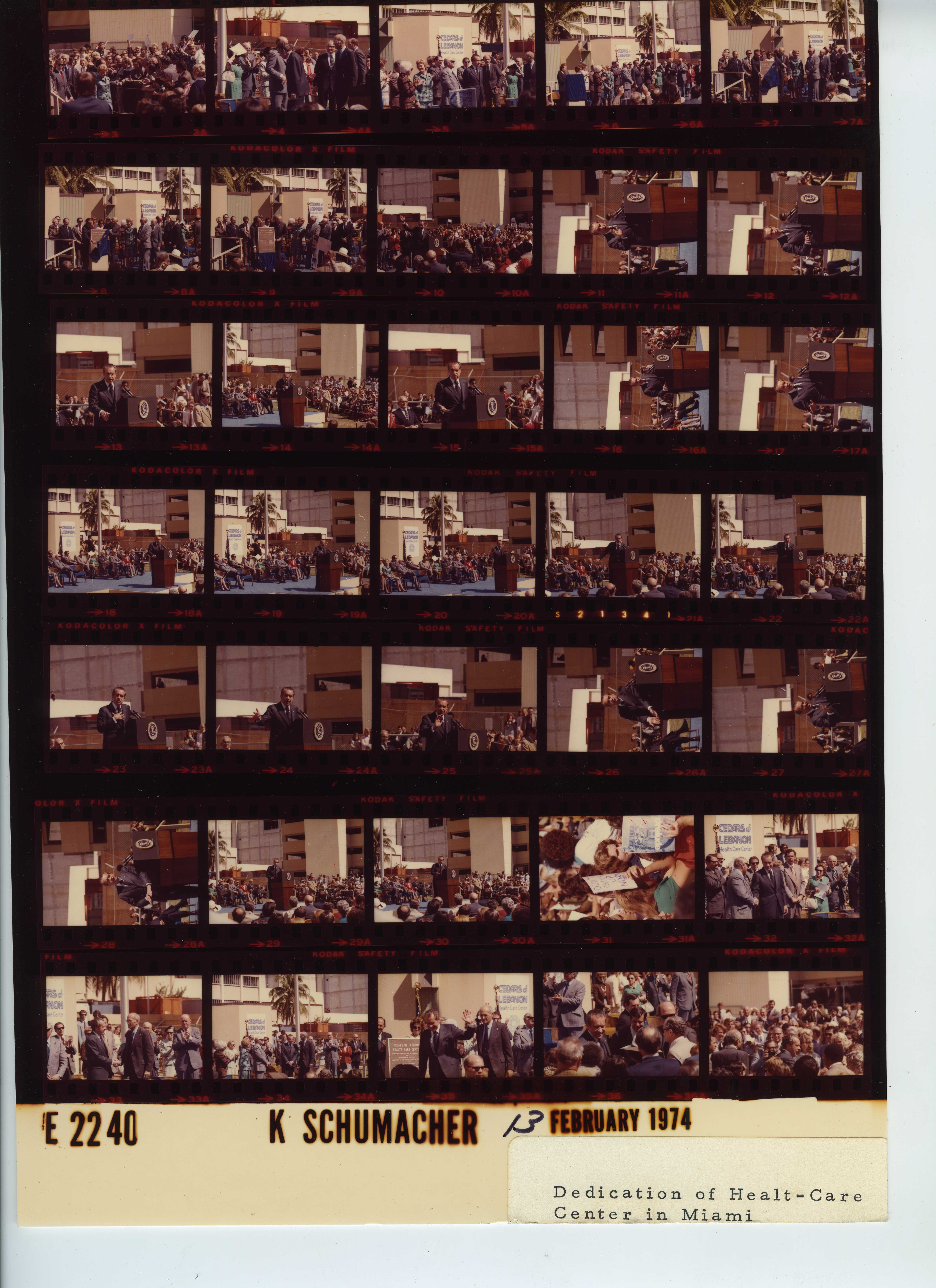 - Frame(s): WHPO-E2223-09, President Nixon speaking at the podium to doctors, nurses, and staff in a large crowd during the dedication ceremony at Cedars of Lebanon Jewish Health Care Medical Center and Hospital in Miami, Florida. View is from behind. 2/13/1974, Miami, Florida Cedars of Lebanon Jewish Health Care Medical Center. President Nixon, doctors, nurses, crowd.