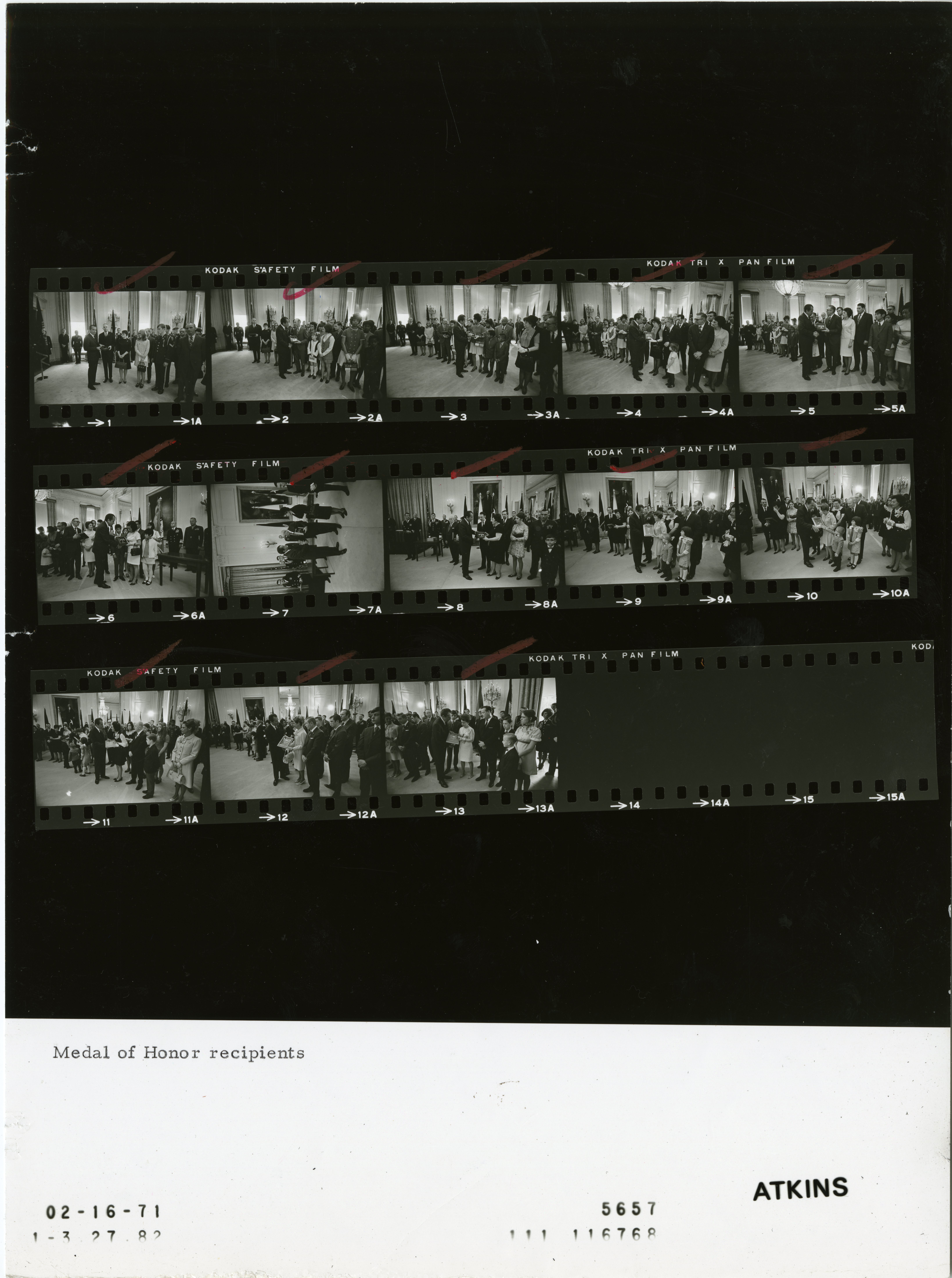 - Frame(s): WHPO-5657-09, President Nixon presenting posthumous Medals of Honor to the families of Cpl. T. Kawanura, SP4 D. Johnston, PFC D. Shea, Ssgt. K. Taylor, Lcpl. T. Noonan, Lcpl. L. Weber, PFC D. Bruce, 1st. Lt. S. Doane, 1st Lt. R. Poxon, SFC W. Bryant, Sgt. C. Fleek, Sg. 2/16/1971, Washington, D.C. White House, Oval Office. President Nixon, Medal of Honor recipient family members, Congressmen, unidentified military officials.