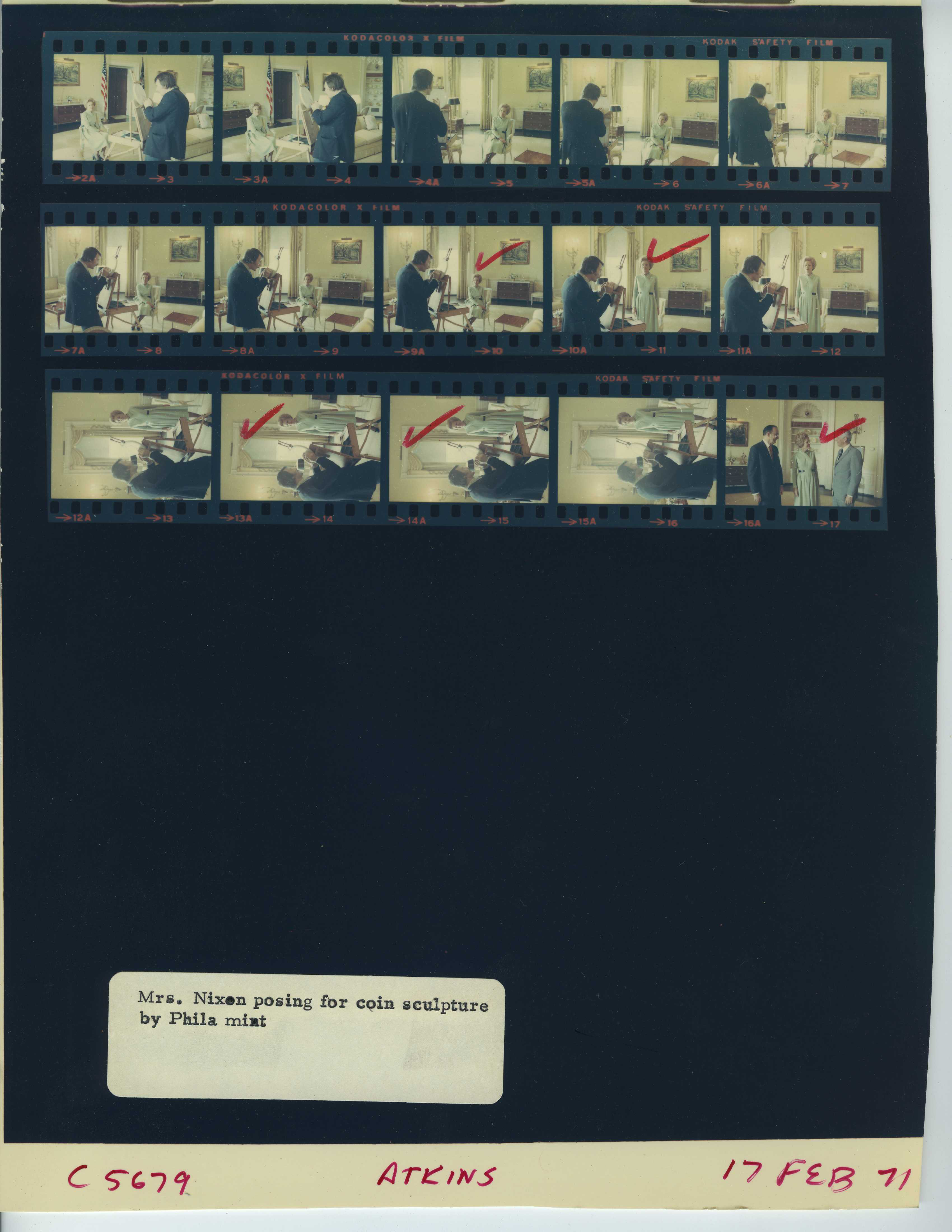 - Frame(s): WHPO-5679-02A-16A, Pat Nixon sitting for a coin sculpture by the Philadelphia Mint. 2/17/1971, Washington, D.C. White House, Yellow Oval Room. Pat Nixon, sculptor, unidentified men.